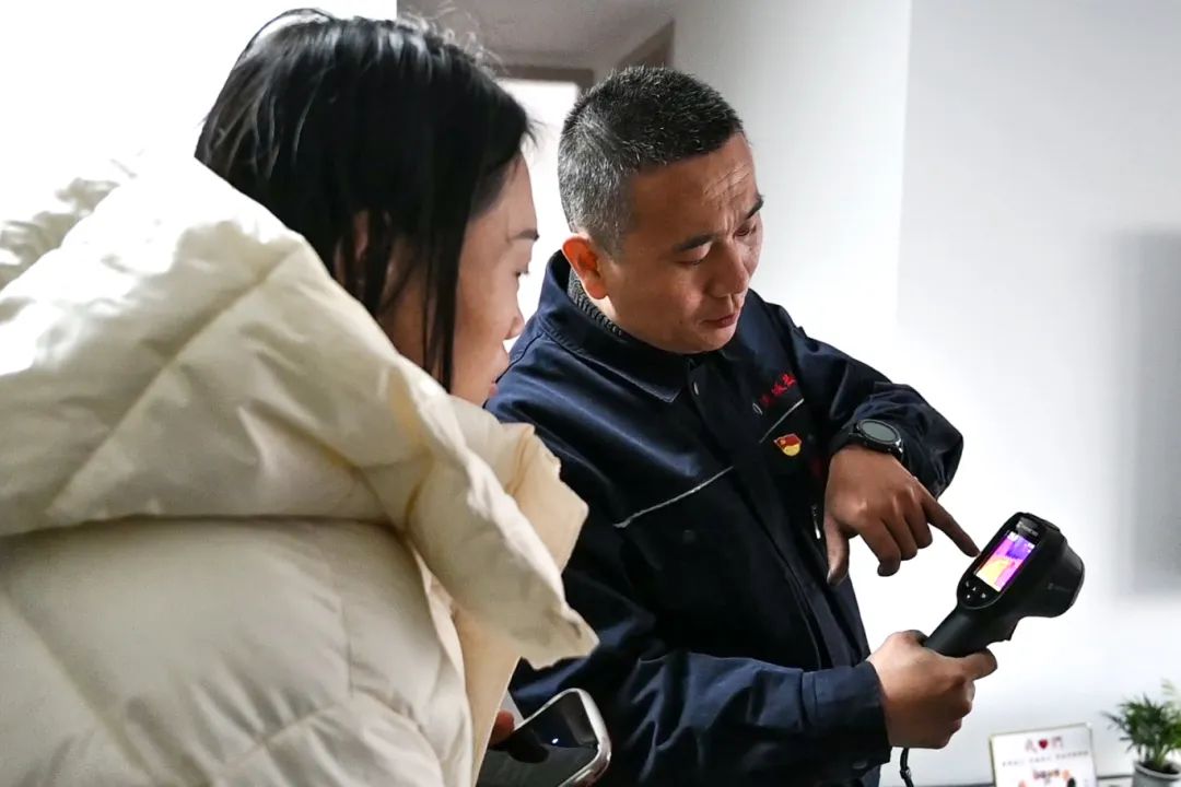 ▲市熱力公司黨員利用熱成像儀入戶處理地暖不熱問題
