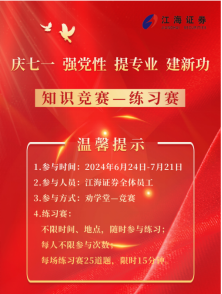 為深入學(xué)習(xí)貫徹習(xí)近平新時(shí)代中國(guó)特色社會(huì)主義思想和黨的二十大精神,落實(shí)證監(jiān)會(huì)系列監(jiān)管要求,持續(xù)加強(qiáng)黨員干部隊(duì)伍建設(shè),江海證券有限公司開(kāi)展“慶七一 強(qiáng)黨性 提專業(yè) 建新功”知識(shí)競(jìng)賽活動(dòng)?;顒?dòng)題庫(kù)涵蓋了中央金融工作會(huì)議、習(xí)近平在省部級(jí)主要領(lǐng)導(dǎo)干部推動(dòng)金融高質(zhì)量發(fā)展專題研討班、“315”系列新規(guī)、新國(guó)九條、黨的二十大精神、黨紀(jì)法規(guī)、企業(yè)文化建設(shè)、合規(guī)文化宣導(dǎo)、風(fēng)險(xiǎn)控制文化宣導(dǎo)、員工執(zhí)業(yè)行為、廉政教育、普法知識(shí)、廉潔從業(yè)等15方面內(nèi)容。截至目前,參與人員覆蓋公司所有條線、部門及各基層黨支部,黨員參與率達(dá)100%,總?cè)舜胃哌_(dá)10252。