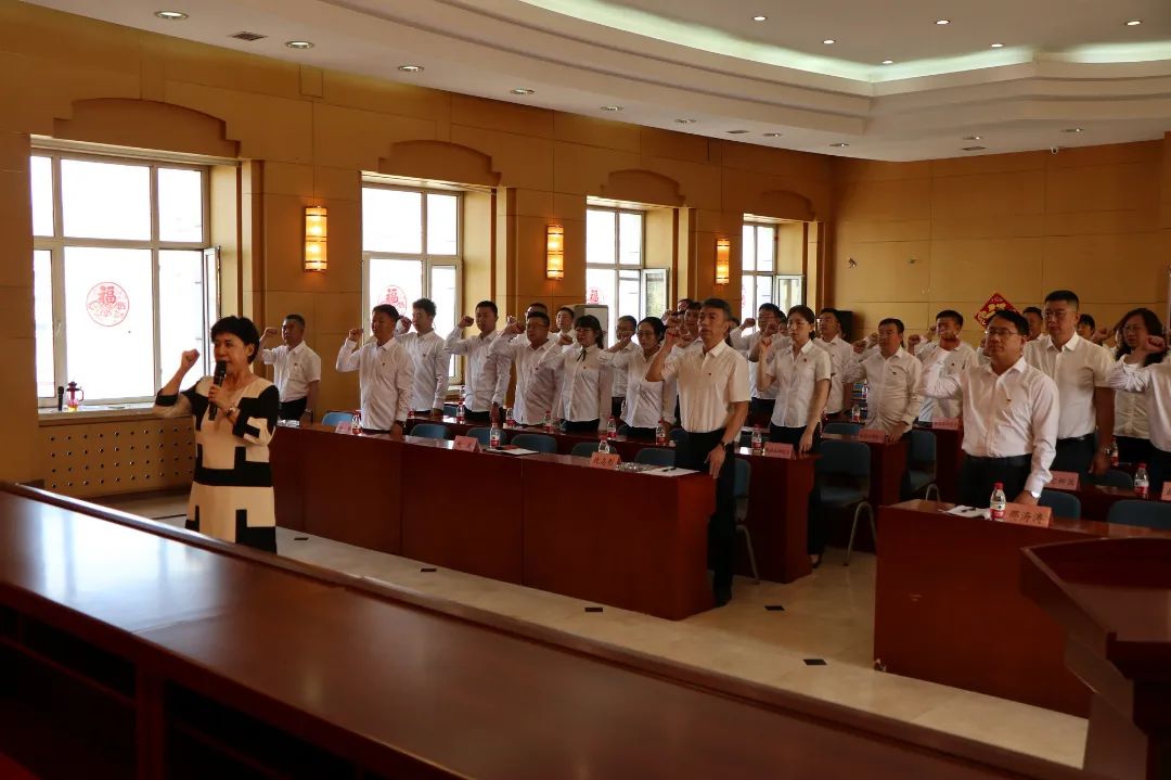5名新黨員和全體老黨員在集團(tuán)公司黨委書記、董事長(zhǎng)辛奇云帶領(lǐng)下面對(duì)黨旗莊嚴(yán)宣誓,許下自己忠誠(chéng)于黨、忠誠(chéng)于人民的錚錚誓言。