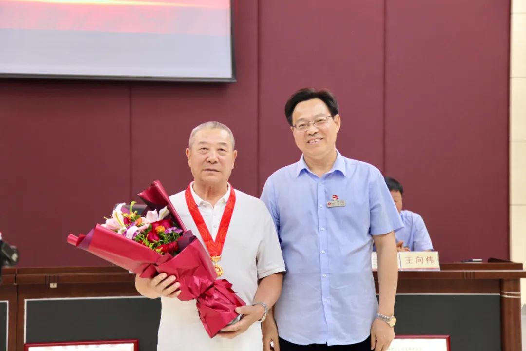 集團(tuán)公司黨委書記、董事長(zhǎng)辛奇云為“光榮在黨50年”黨員張榮同志頒發(fā)紀(jì)念章。