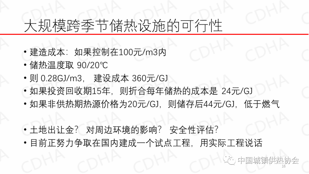 不算土地出讓金,這個事100元每立方米應(yīng)該能做出來。如果我們努力讓這100塊錢一立方米這事給他做成,儲熱溫度是90℃/20℃的話,那樣一立方米就能出0.28GJ的熱量,建設(shè)成本360塊錢1GJ,如果投資是15年,每年儲熱成本是24塊錢1GJ。比燃?xì)獾倪€便宜。這樣通過儲熱(可以)替代燃?xì)?,但是這個(計算)沒有包括土地出讓金,它屬于是國家政策的事兒。