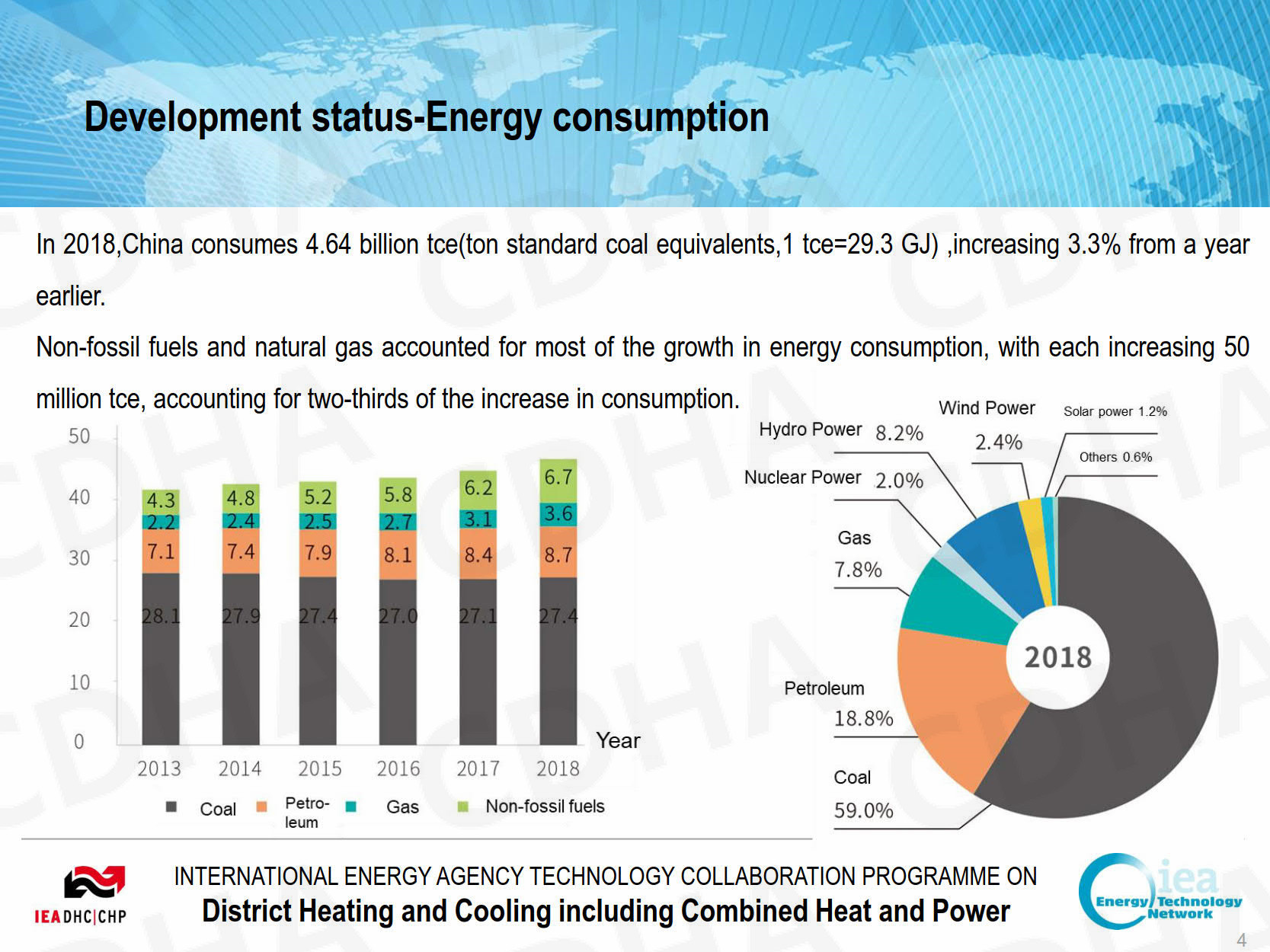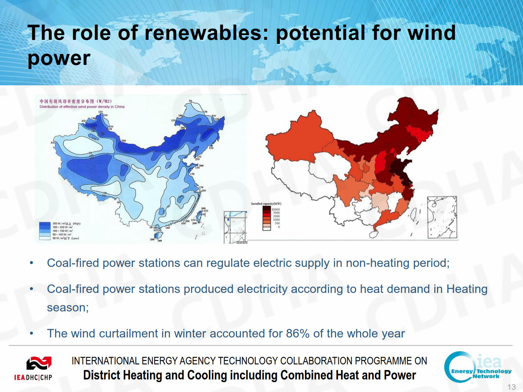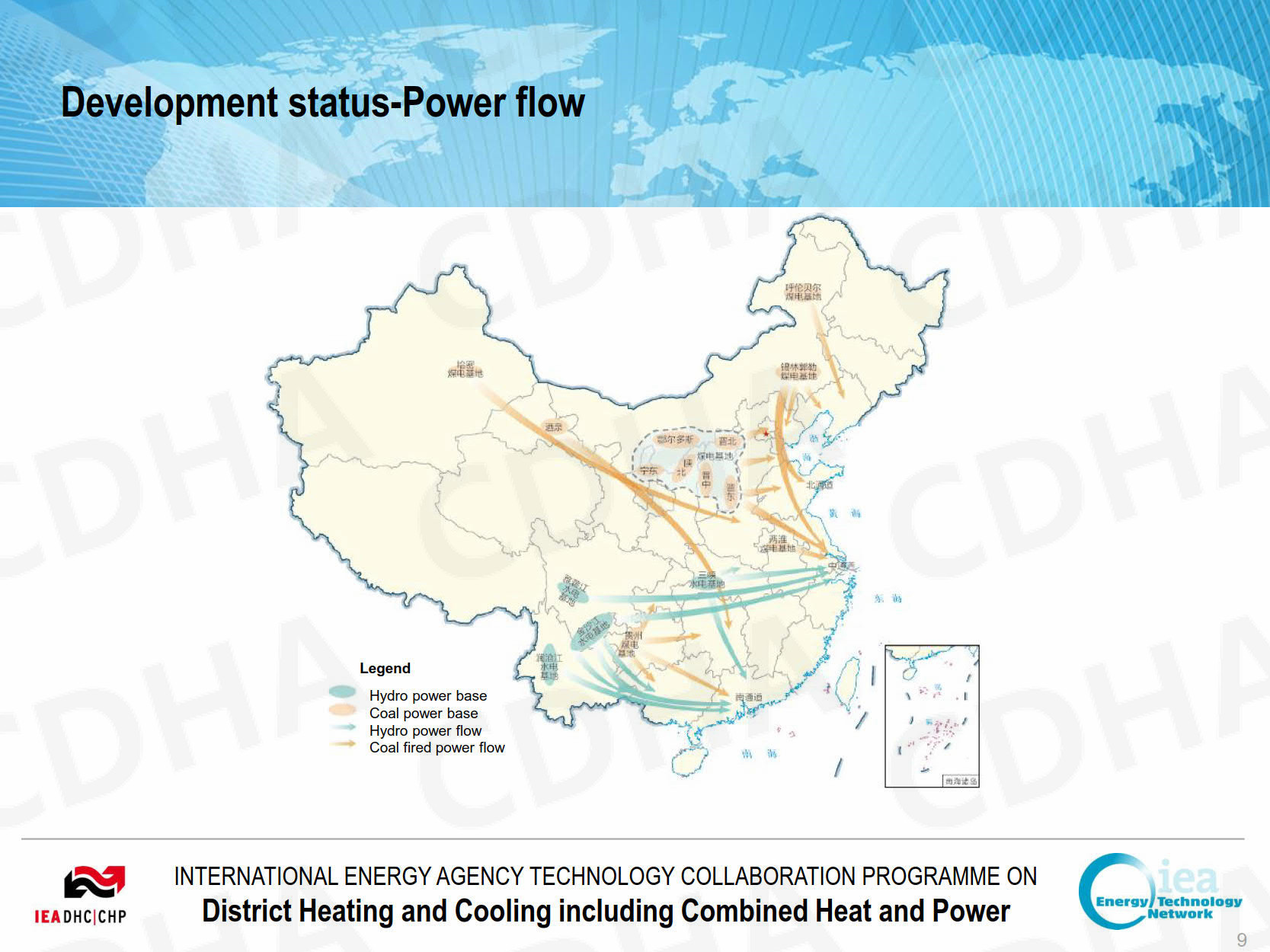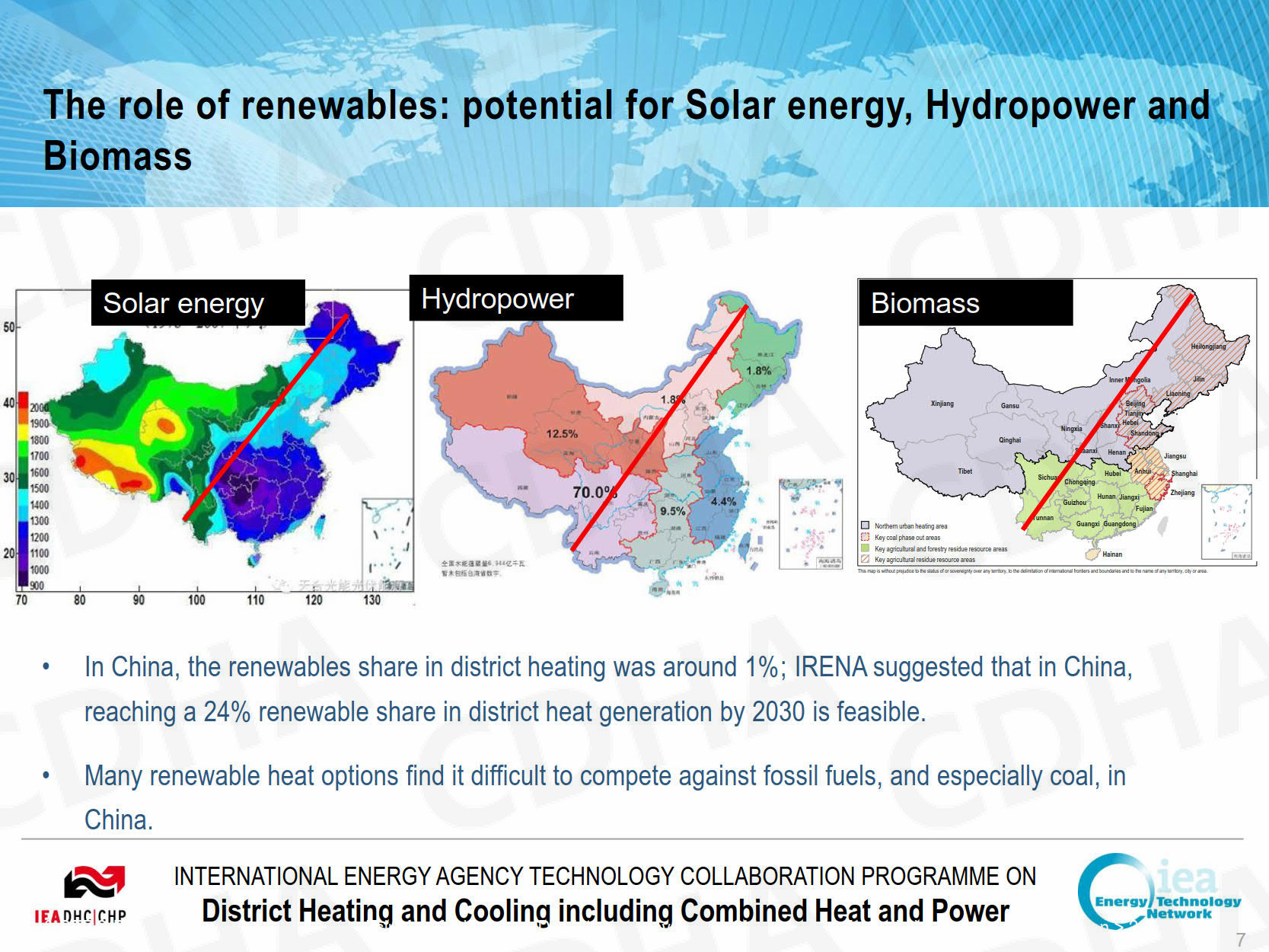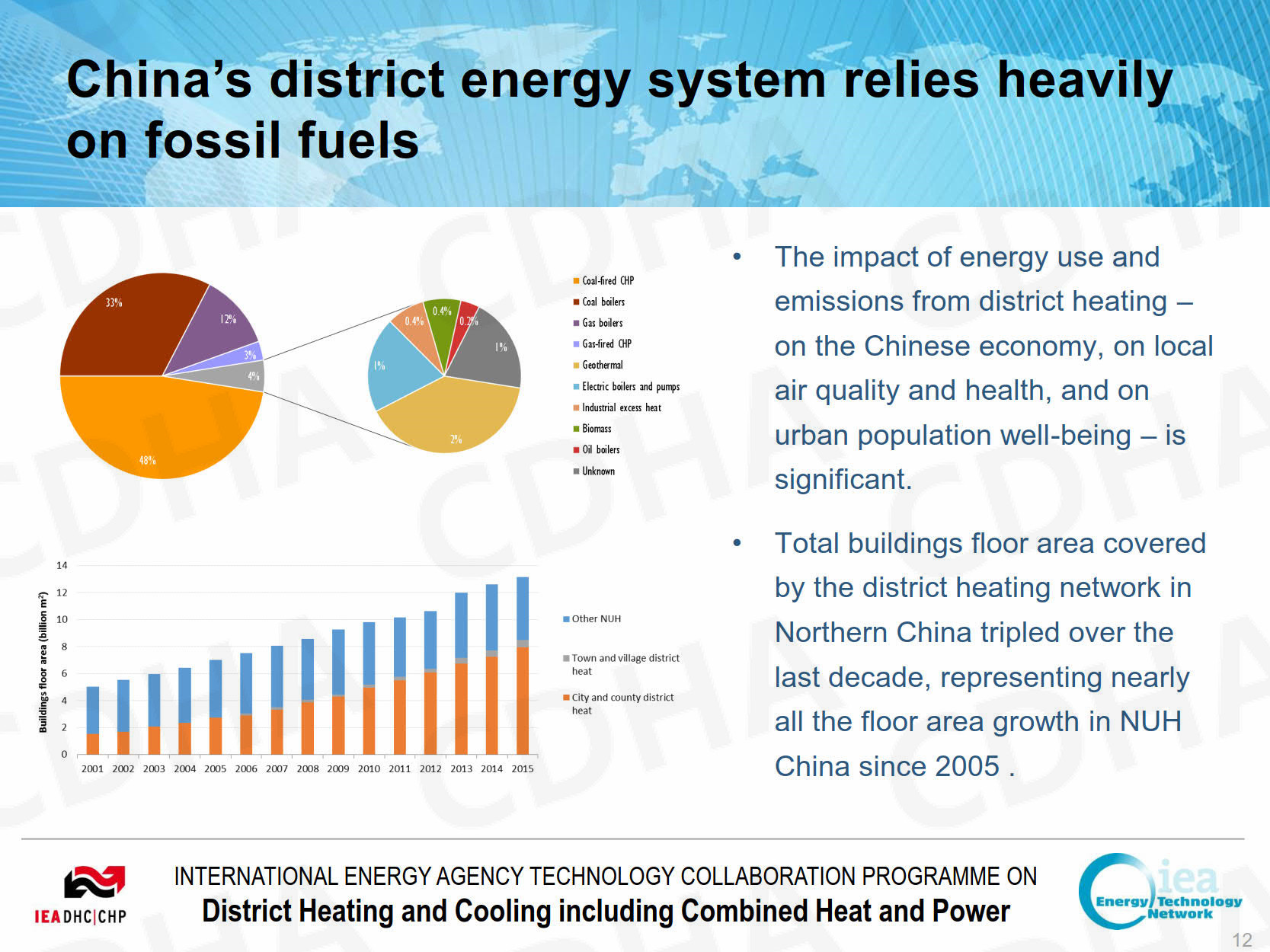 通過(guò)長(zhǎng)距離的能源運(yùn)輸,把這些能源從中國(guó)的西部地區(qū)或者是西南部地區(qū)向北部地區(qū)或者是東部地區(qū)進(jìn)行運(yùn)輸,這個(gè)就是我們正在考慮的有關(guān)于可再生能源利用的重要內(nèi)容,現(xiàn)在我們來(lái)看一下供熱這個(gè)領(lǐng)域。中國(guó)擁有世界上最大、發(fā)展最快的區(qū)域能源系統(tǒng),我們有19萬(wàn)公里的熱水管網(wǎng)和11萬(wàn)公里的蒸汽管網(wǎng),與能源系統(tǒng)進(jìn)行相比的話,我們面臨著非常多的挑戰(zhàn),因?yàn)槲覀兗s有90%的供熱主要還是來(lái)自于煤炭的,這也是我們現(xiàn)在正在面臨的問(wèn)題,我們應(yīng)該進(jìn)行一個(gè)反思,我們到底應(yīng)該怎么去做?怎么樣才能夠增加更多的可再生能源的使用,能夠提高能源的效率,比如說(shuō)未來(lái)天然氣我們應(yīng)該怎么用?我們應(yīng)該來(lái)考慮相關(guān)的商業(yè)模式,或者是定價(jià)等等相關(guān)的問(wèn)題。