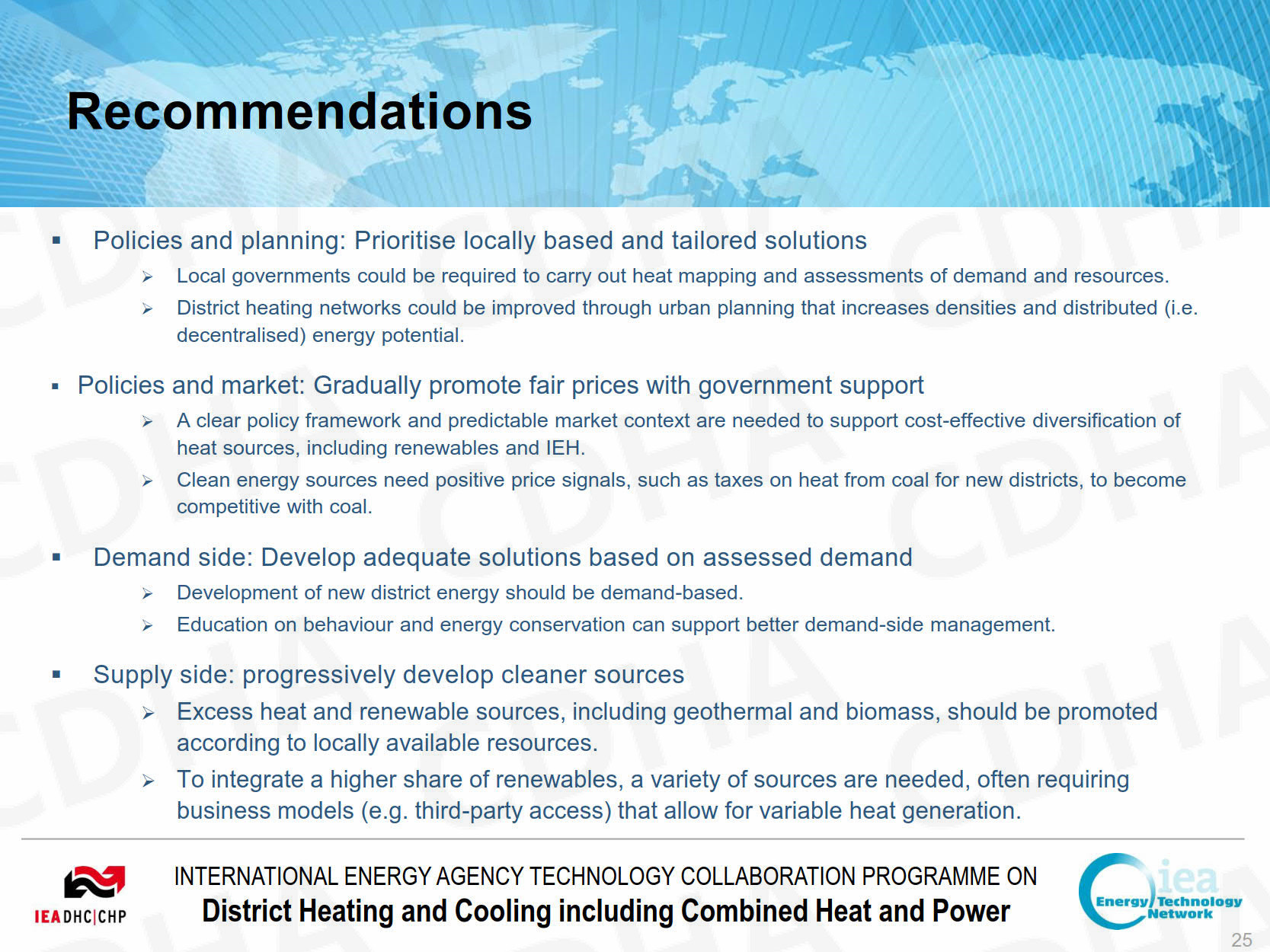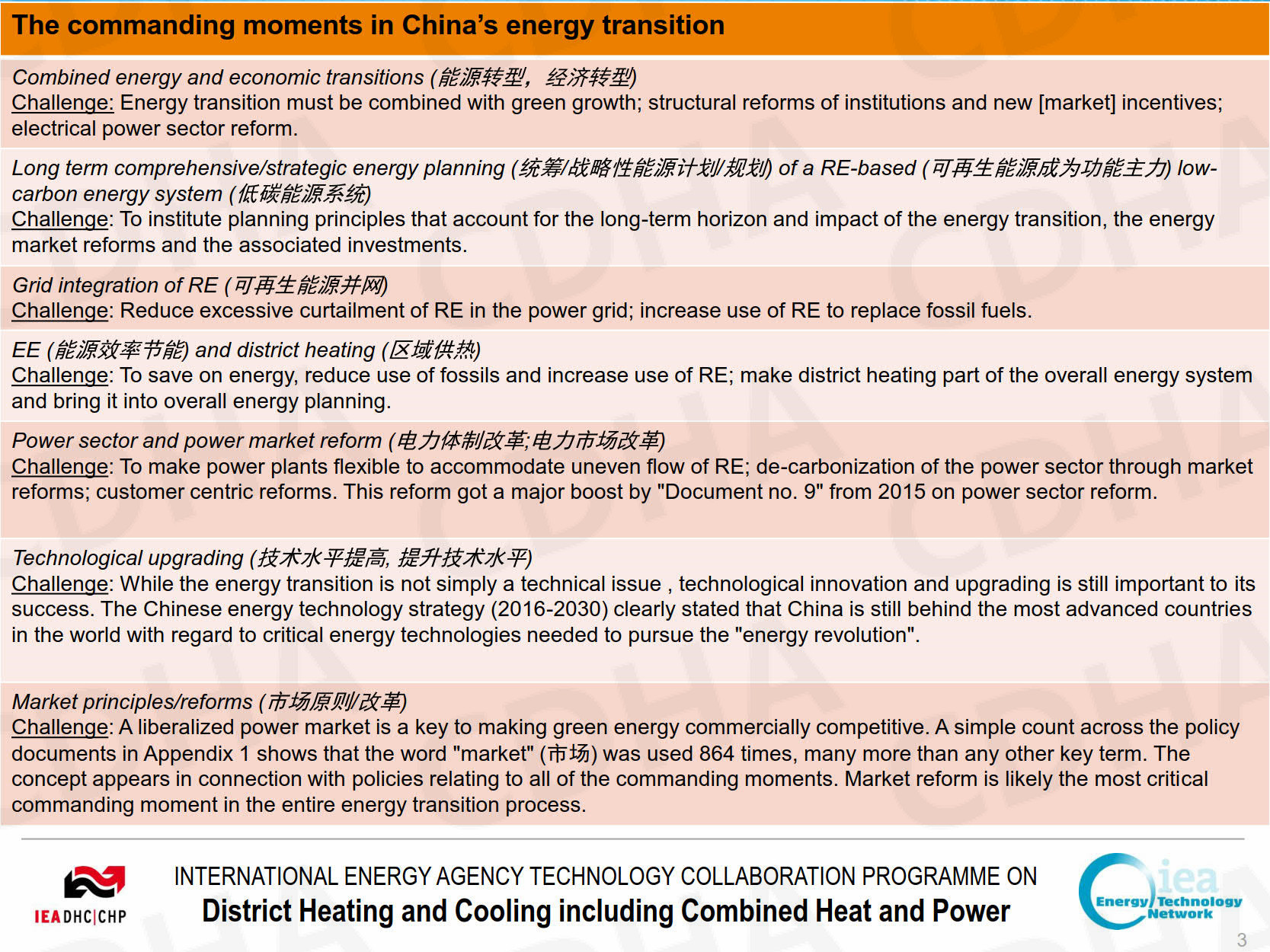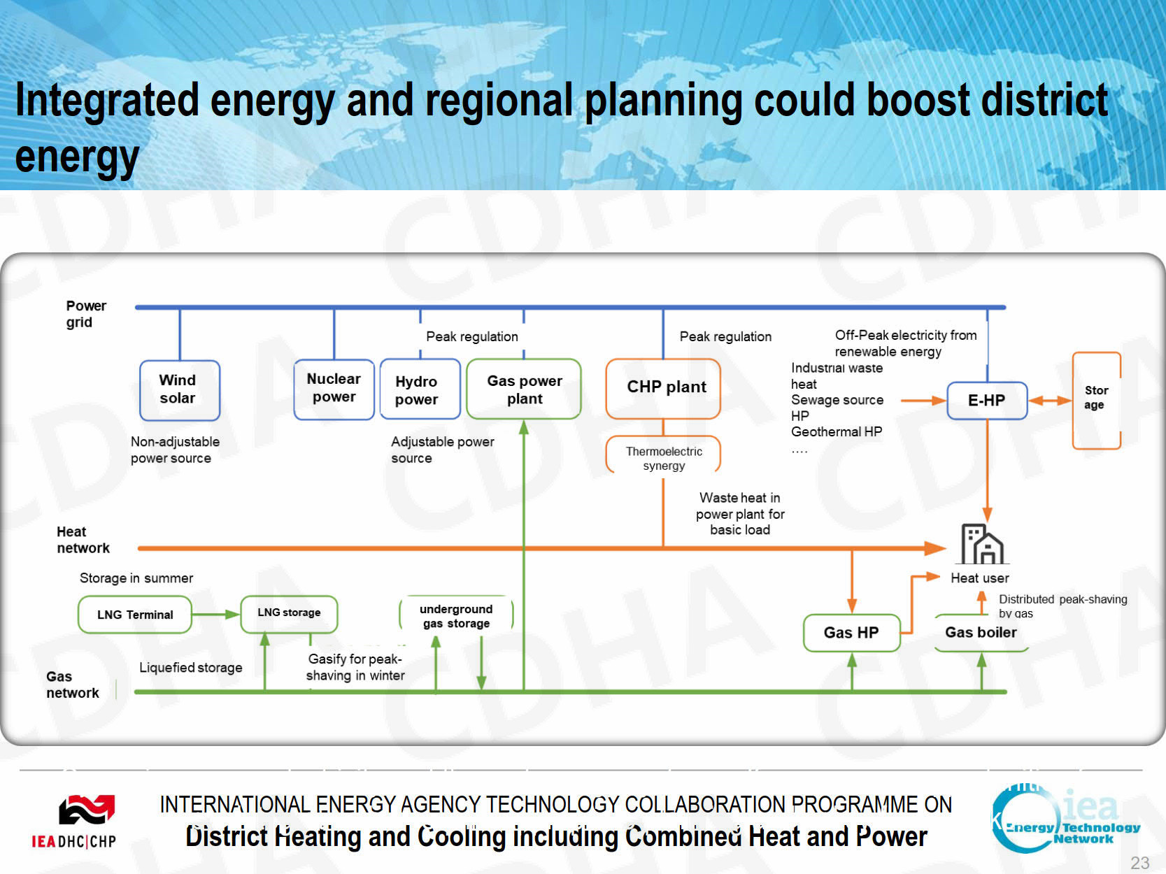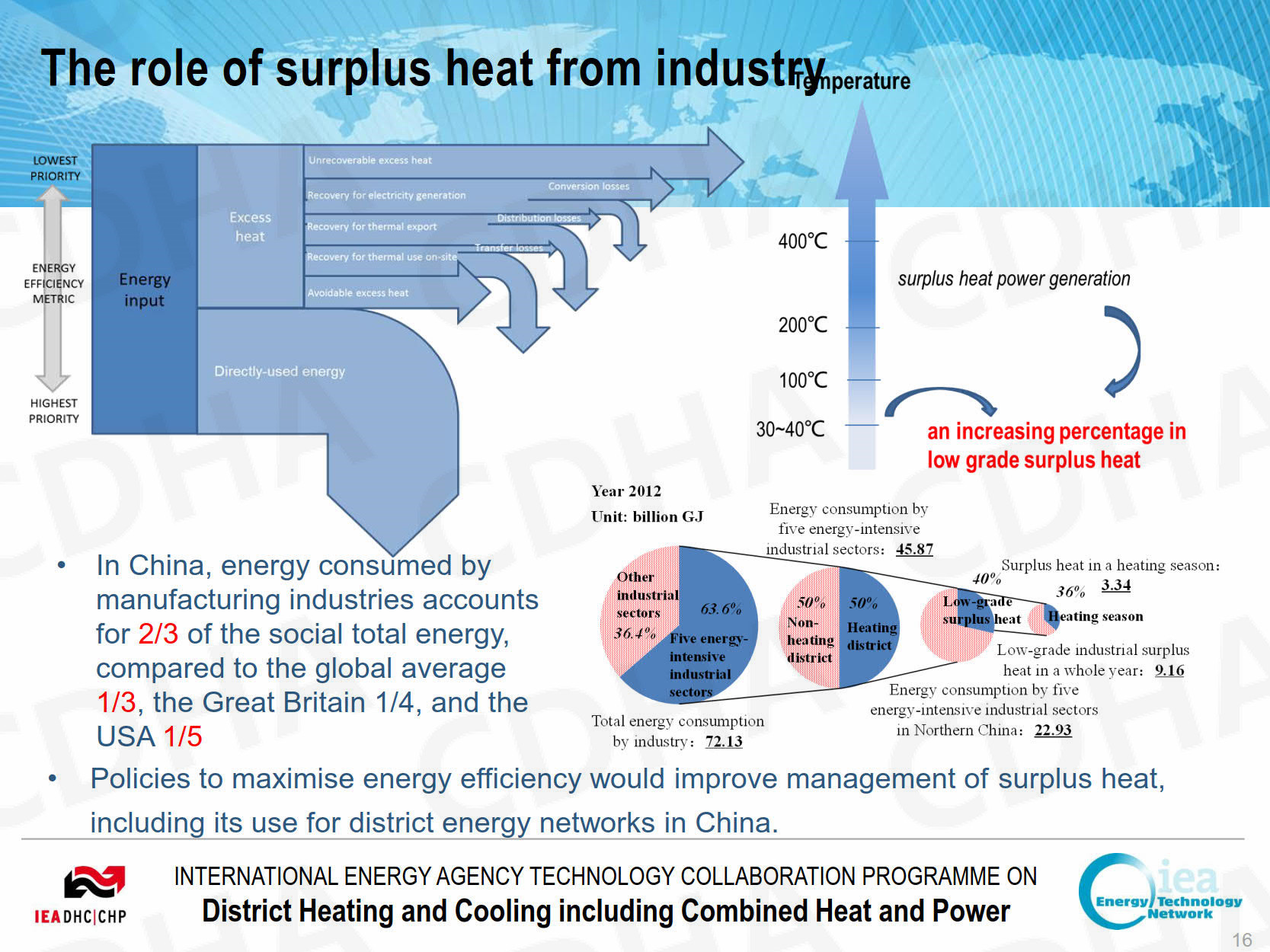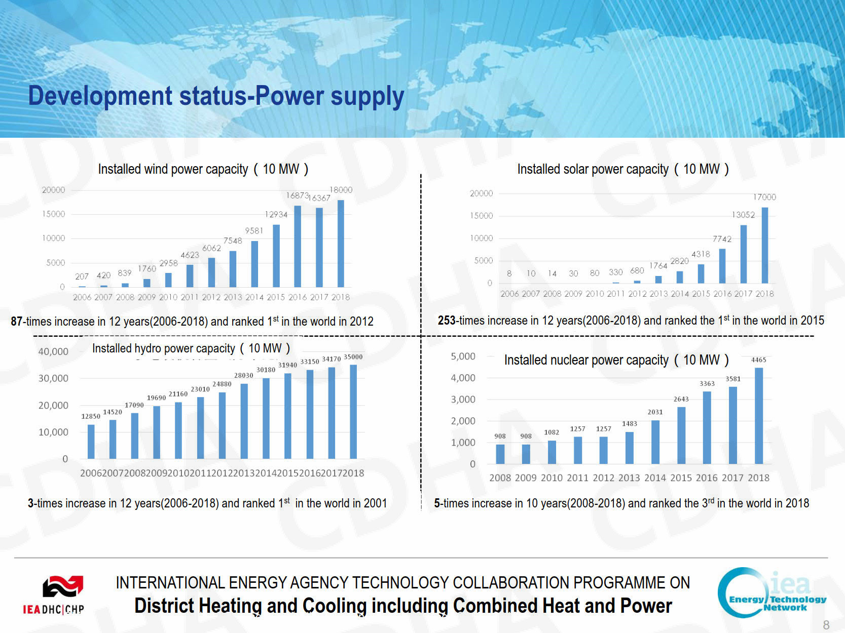通過(guò)長(zhǎng)距離的能源運(yùn)輸,把這些能源從中國(guó)的西部地區(qū)或者是西南部地區(qū)向北部地區(qū)或者是東部地區(qū)進(jìn)行運(yùn)輸,這個(gè)就是我們正在考慮的有關(guān)于可再生能源利用的重要內(nèi)容,現(xiàn)在我們來(lái)看一下供熱這個(gè)領(lǐng)域。中國(guó)擁有世界上最大、發(fā)展最快的區(qū)域能源系統(tǒng),我們有19萬(wàn)公里的熱水管網(wǎng)和11萬(wàn)公里的蒸汽管網(wǎng),與能源系統(tǒng)進(jìn)行相比的話,我們面臨著非常多的挑戰(zhàn),因?yàn)槲覀兗s有90%的供熱主要還是來(lái)自于煤炭的,這也是我們現(xiàn)在正在面臨的問(wèn)題,我們應(yīng)該進(jìn)行一個(gè)反思,我們到底應(yīng)該怎么去做?怎么樣才能夠增加更多的可再生能源的使用,能夠提高能源的效率,比如說(shuō)未來(lái)天然氣我們應(yīng)該怎么用?我們應(yīng)該來(lái)考慮相關(guān)的商業(yè)模式,或者是定價(jià)等等相關(guān)的問(wèn)題。
