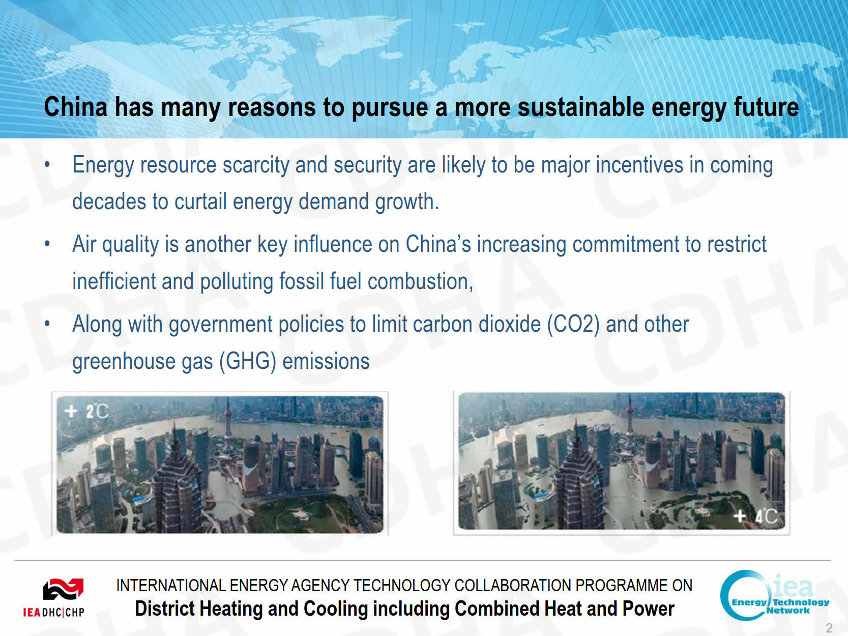 感謝今天可以來(lái)做這個(gè)有關(guān)于中國(guó)供熱問(wèn)題的匯報(bào),說(shuō)到供熱,我們要先說(shuō)一下能源問(wèn)題,因?yàn)楣嵋彩悄茉聪到y(tǒng)當(dāng)中重要的一環(huán),可以看到和其他國(guó)家一樣,中國(guó)實(shí)現(xiàn)更可持續(xù)的能源未來(lái),有非常多的理由,其中最重要除了資源的缺乏和能源安全問(wèn)題,還有就是我們也加入了巴黎協(xié)定,要進(jìn)一步應(yīng)對(duì)氣候變化。