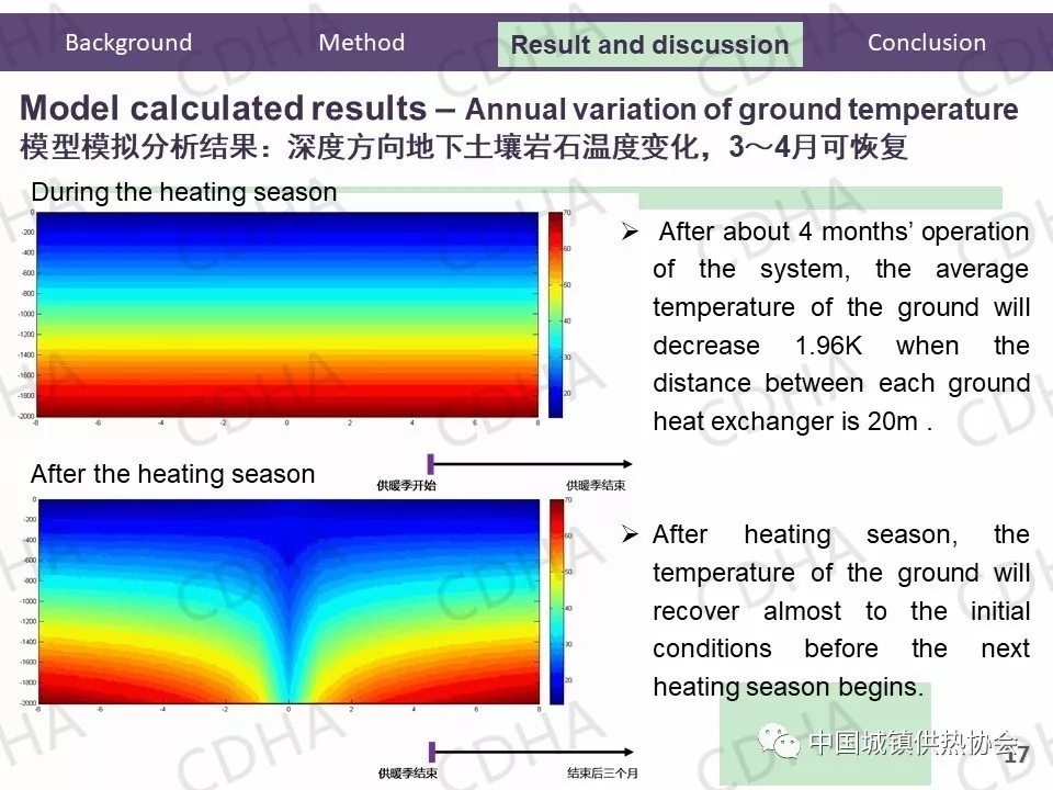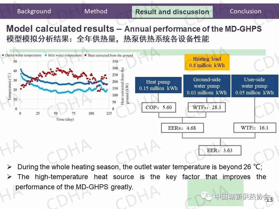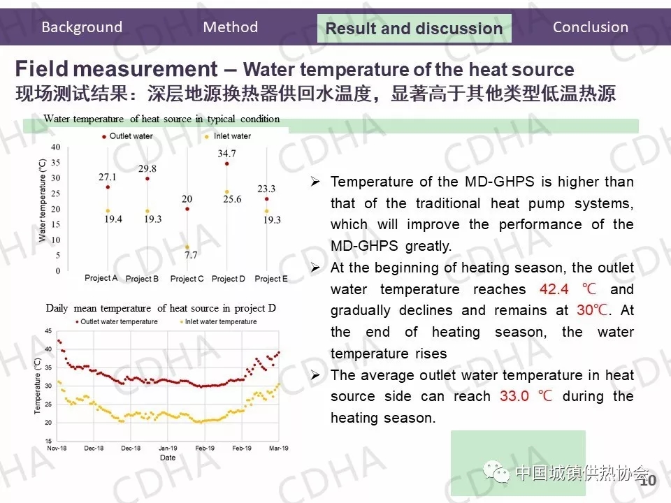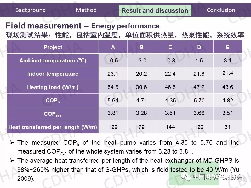這是實(shí)測(cè)的結(jié)果。即使是在同一個(gè)地區(qū)它的實(shí)際換熱效果也會(huì)有所區(qū)別,原因就是地下情況的隨機(jī)性和復(fù)雜性。但是即使是這樣的一個(gè)系統(tǒng)大家可以看到,和傳統(tǒng)的淺層地?zé)崮芟啾龋某鏊疁囟纫叩枚?,熱泵機(jī)組的效率還是比較高的。