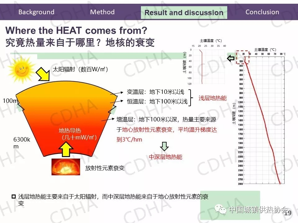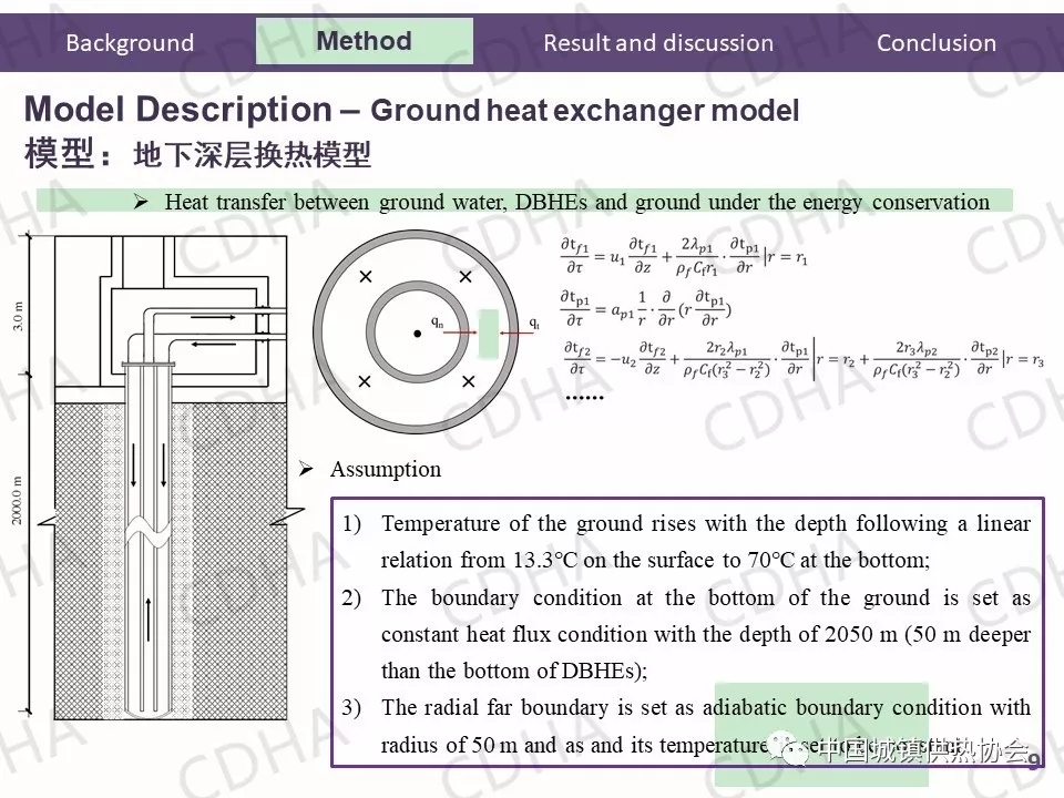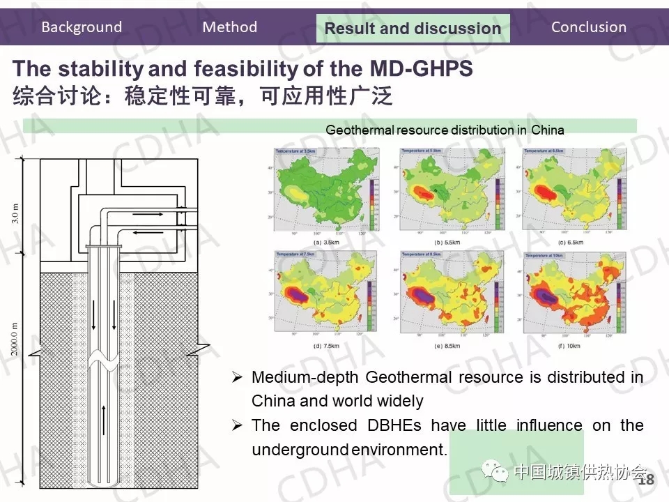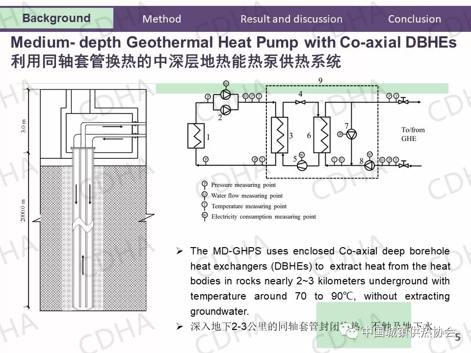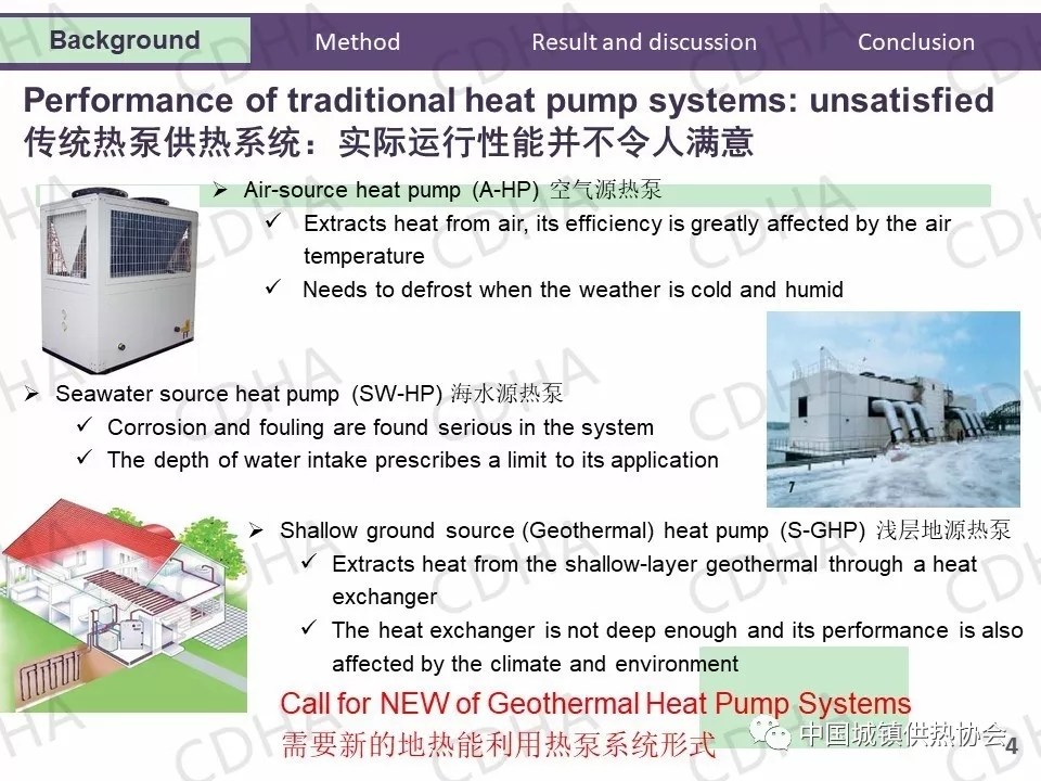 今天我向大家做一個(gè)匯報(bào),演講題目就是利用同軸套管的換熱裝置和熱泵的中深層地?zé)崮芄嵯到y(tǒng)分析。通過(guò)把套管換熱機(jī)組和熱泵機(jī)組相結(jié)合,實(shí)現(xiàn)一種中深層地?zé)崮茏鳛榈蜏責(zé)嵩磽Q熱,并對(duì)其進(jìn)行實(shí)際性能的分析。那么我將從以下四個(gè)方面來(lái)給大家做一個(gè)介紹,首先是背景和方法,然后是結(jié)果與討論,最后是結(jié)論。