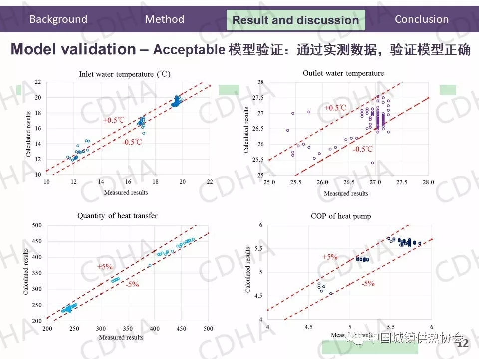 那么有實(shí)測(cè)數(shù)據(jù)之后我們又進(jìn)行了模擬分析,把實(shí)測(cè)的和模擬的結(jié)果進(jìn)行了一個(gè)對(duì)比,在不同的進(jìn)口溫度和不同流量的情況下,無(wú)論是水溫的模擬分析,還是換熱量的模擬分析,還是實(shí)測(cè)的熱泵機(jī)組的模擬分析,通過(guò)實(shí)測(cè)數(shù)據(jù)驗(yàn)證了我們的模型還是比較準(zhǔn)確的。有了這個(gè)之后就可以用這個(gè)模型來(lái)做整個(gè)系統(tǒng)設(shè)計(jì)和運(yùn)行優(yōu)化了,這里面我給出了幾個(gè)例子。