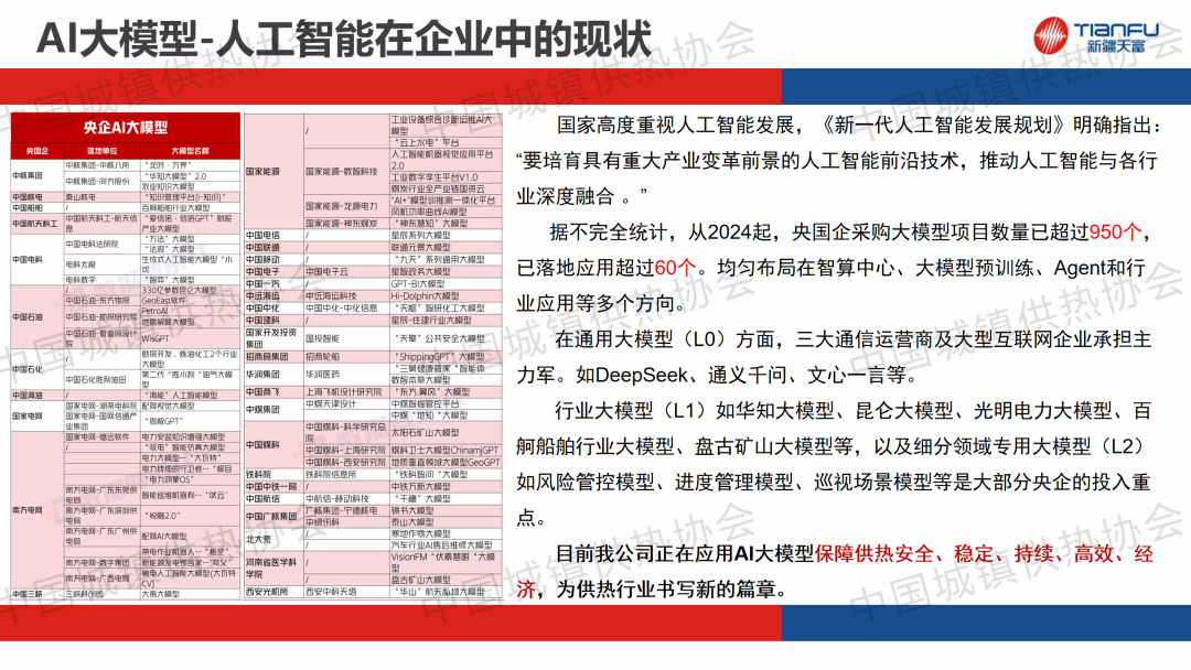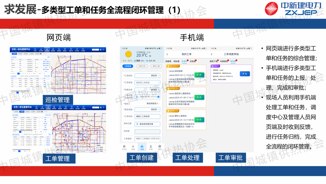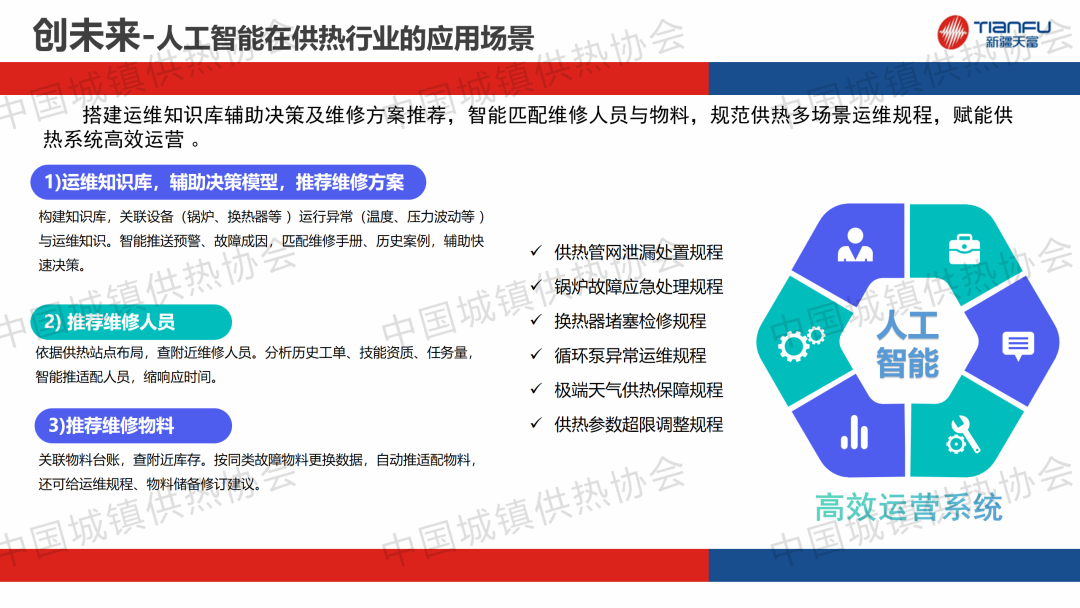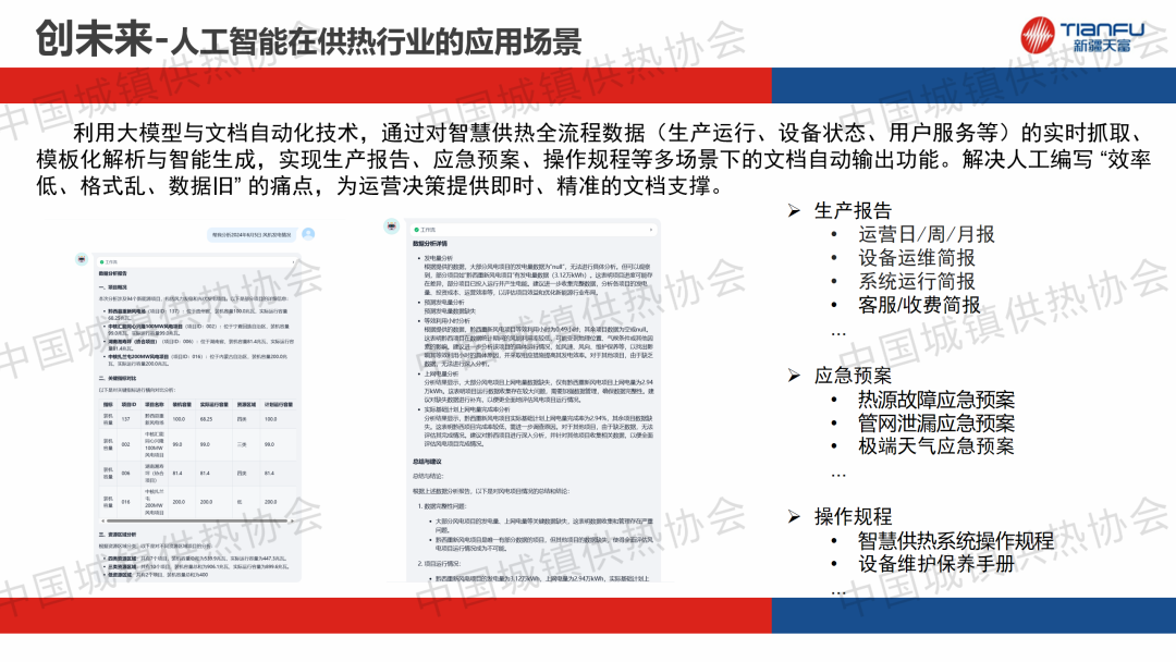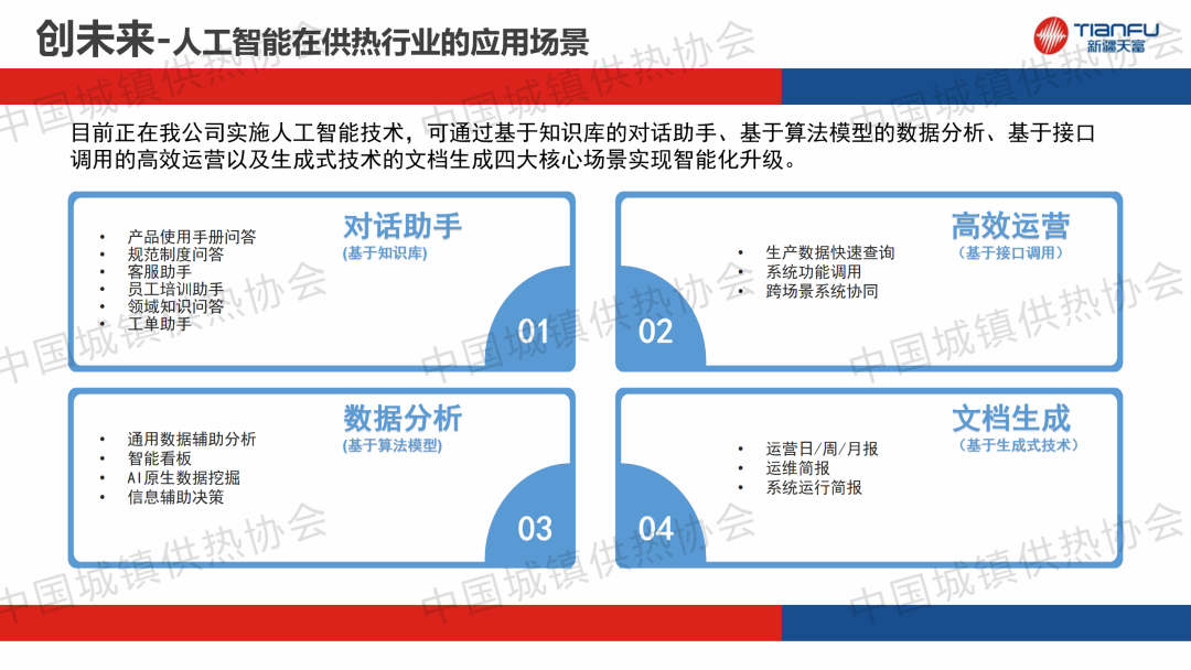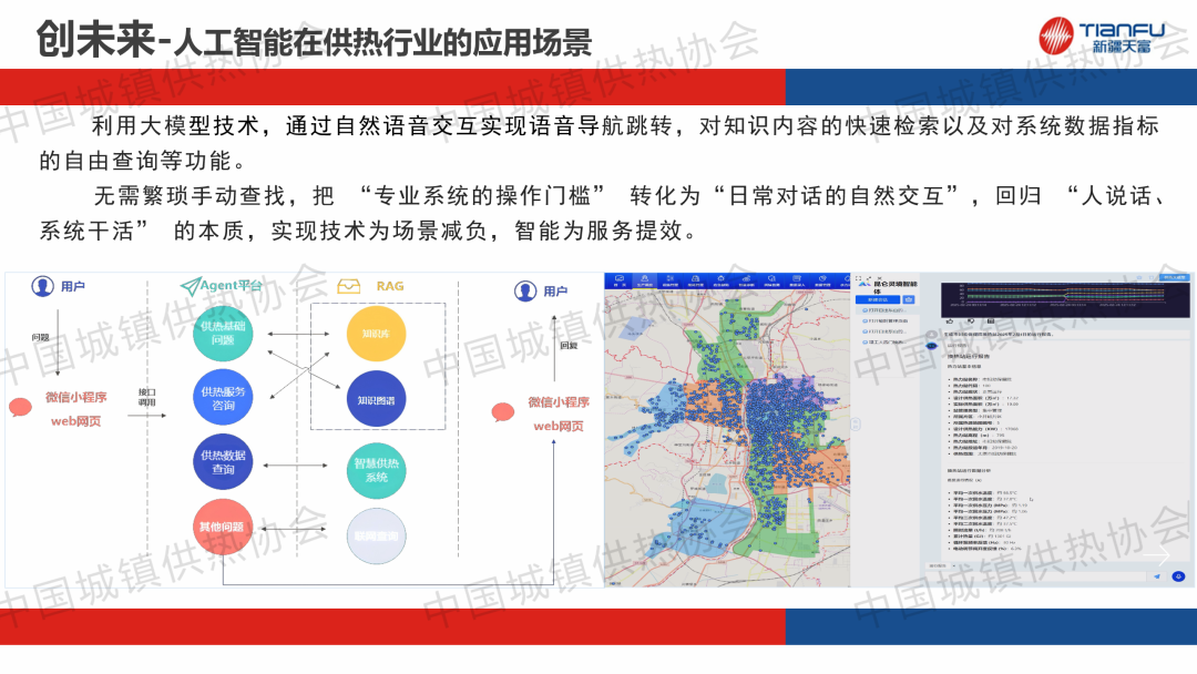 “供熱系統(tǒng)智能運行與調(diào)控”主題論壇上,中新建電力集團(tuán)天富能源股份有限公司供熱分公司副總經(jīng)理劉紅建作了關(guān)于“基于人工智能技術(shù)的供熱智慧平臺應(yīng)用研究與提質(zhì)增效的實踐分享”的主題演講,分享了供熱企業(yè)提質(zhì)增效的管理經(jīng)驗。通過建立供熱管理平臺,實現(xiàn)多類型工單和任務(wù)全流程的閉環(huán)管理,未來將通過對話助手、數(shù)據(jù)分析、高效運營以及文檔生成四大核心場景實現(xiàn)智能化升級。