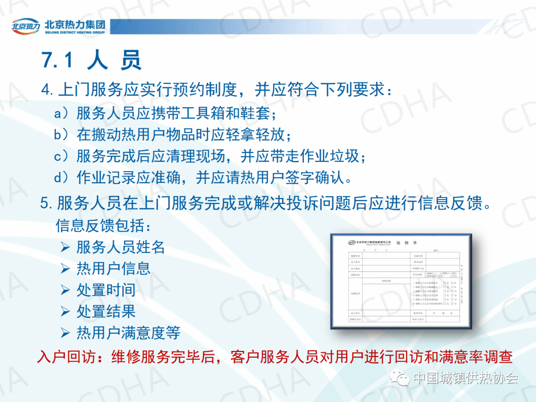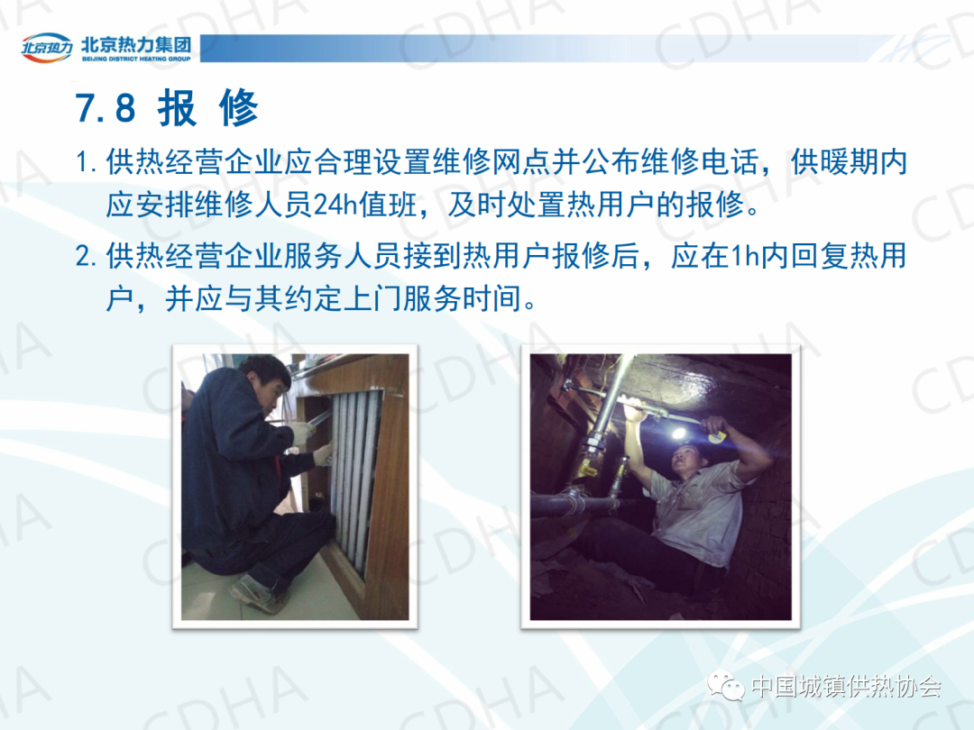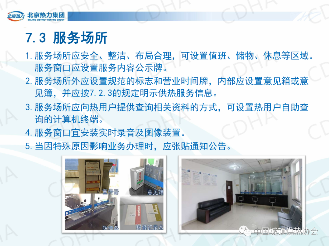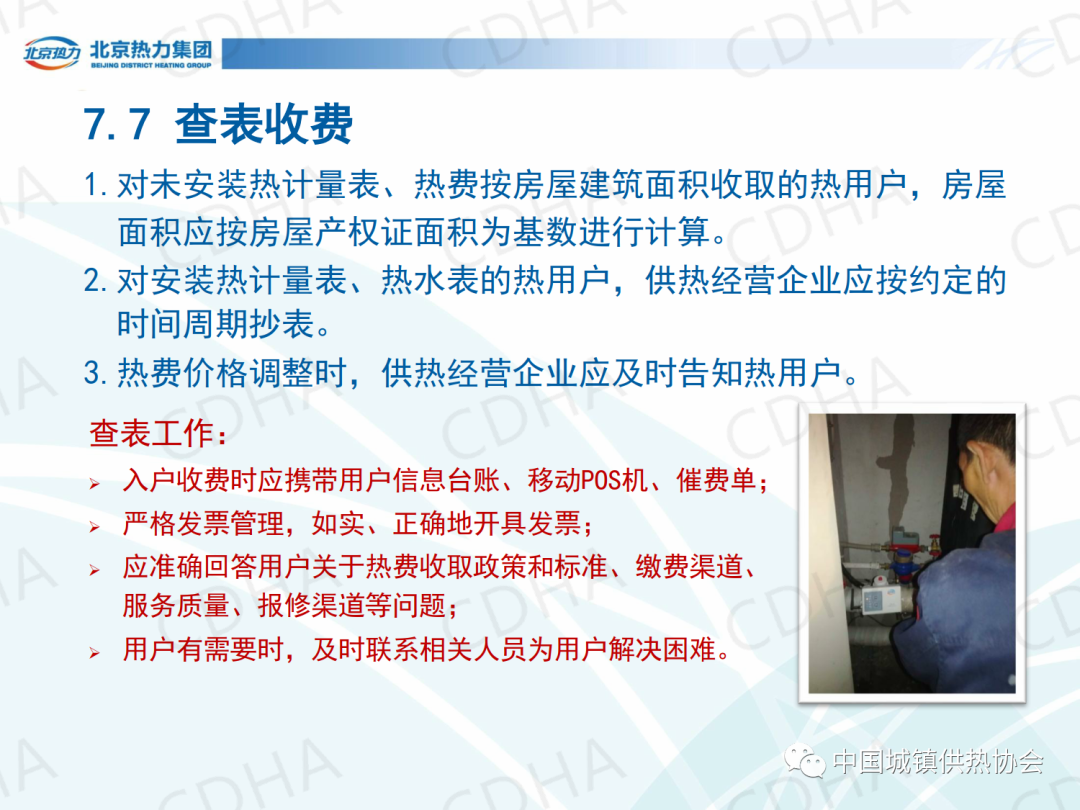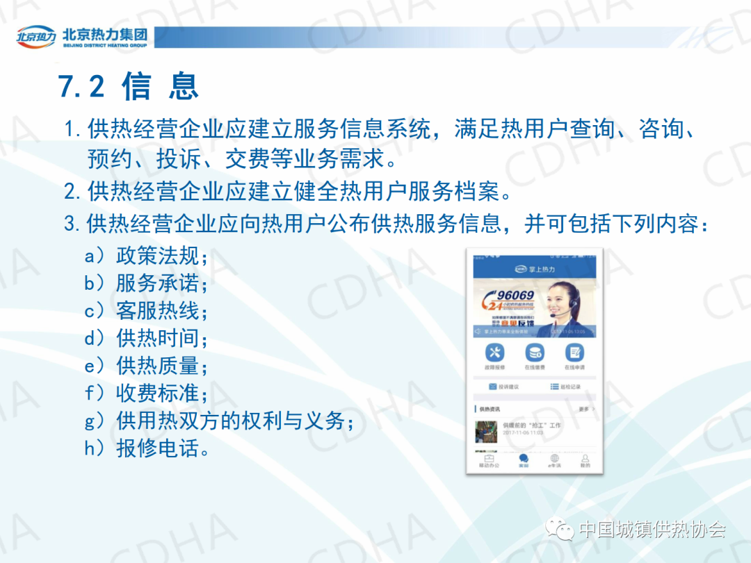 培訓(xùn)會上,北京市熱力集團(tuán)有限責(zé)任公司西城分公司黨委書記唐衛(wèi)圍繞《城鎮(zhèn)供熱服務(wù)》的第7章節(jié)內(nèi)容,介紹了城鎮(zhèn)供熱服務(wù)中人員、信息、服務(wù)場所、業(yè)務(wù)受理、投訴受理、室溫抽測、查表收費、報修八個方面的規(guī)定。課件內(nèi)容分享如下: