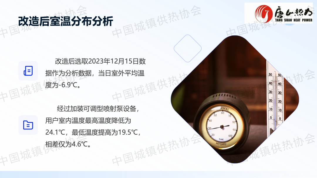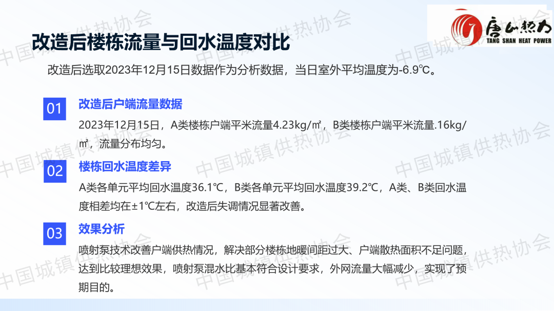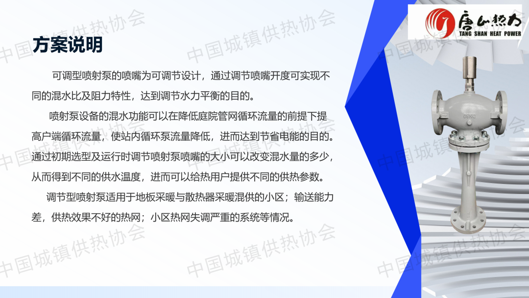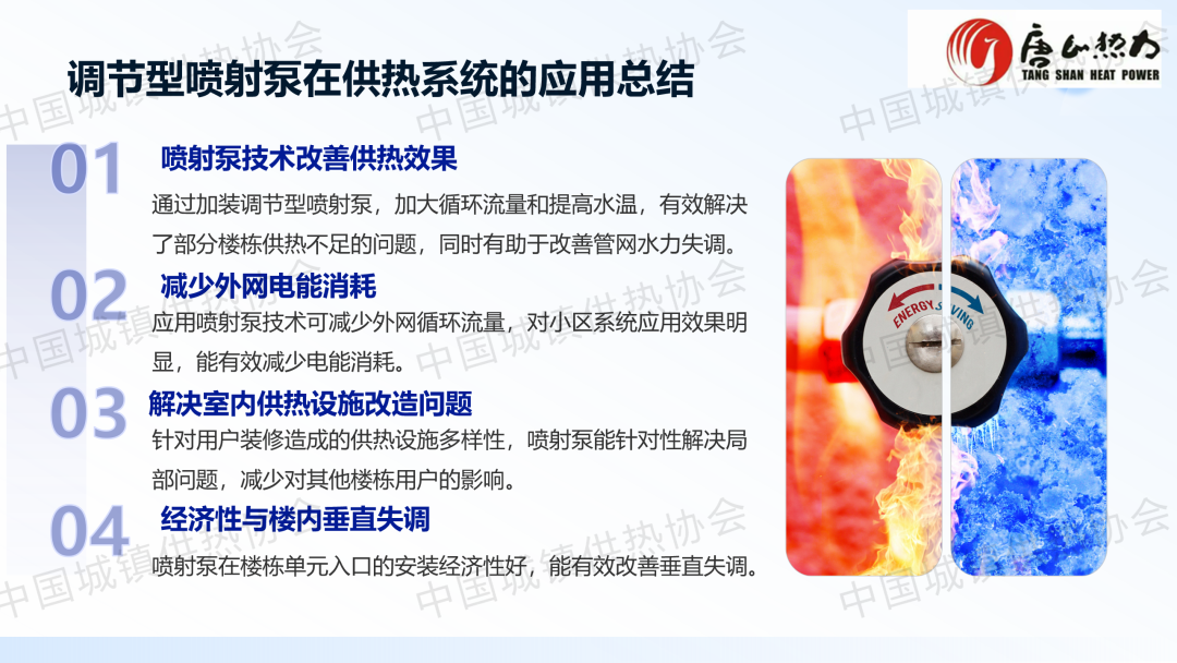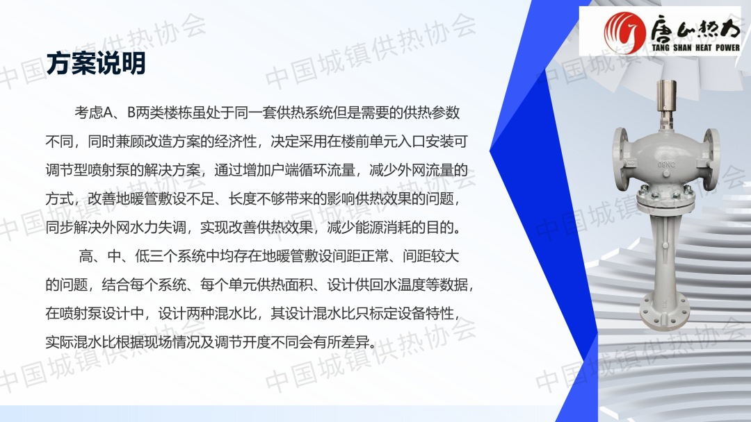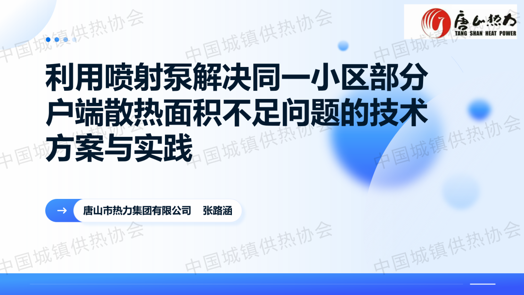第七屆中國(guó)供熱學(xué)術(shù)年會(huì)熱力新秀唐山市熱力集團(tuán)有限公司張路涵就論文內(nèi)容作了題為“利用噴射泵解決同一小區(qū)部分戶端散熱面積不足問(wèn)題的技術(shù)方案與實(shí)踐”的演講,介紹了小區(qū)供熱概況、解決方案、供熱運(yùn)行溫度曲線、改造效果。總結(jié)提出,調(diào)節(jié)型噴射泵在供熱運(yùn)行中展現(xiàn)出良好的效果和推廣價(jià)值,對(duì)于解決供熱問(wèn)題和節(jié)能具有重要意義。通過(guò)加裝調(diào)節(jié)型噴射泵,加大循環(huán)流量和提高水溫,有效解決了部分樓棟供熱不足的問(wèn)題,同時(shí)有助于改善管網(wǎng)水力失調(diào);減少外網(wǎng)循環(huán)流量,對(duì)小區(qū)系統(tǒng)應(yīng)用效果明顯,能有效減少電能消耗;解決室內(nèi)供熱設(shè)施改造問(wèn)題,減少對(duì)其他樓棟用戶的影響;噴射泵在樓棟單元入口的安裝經(jīng)濟(jì)性好,能有效改善垂直失調(diào)。