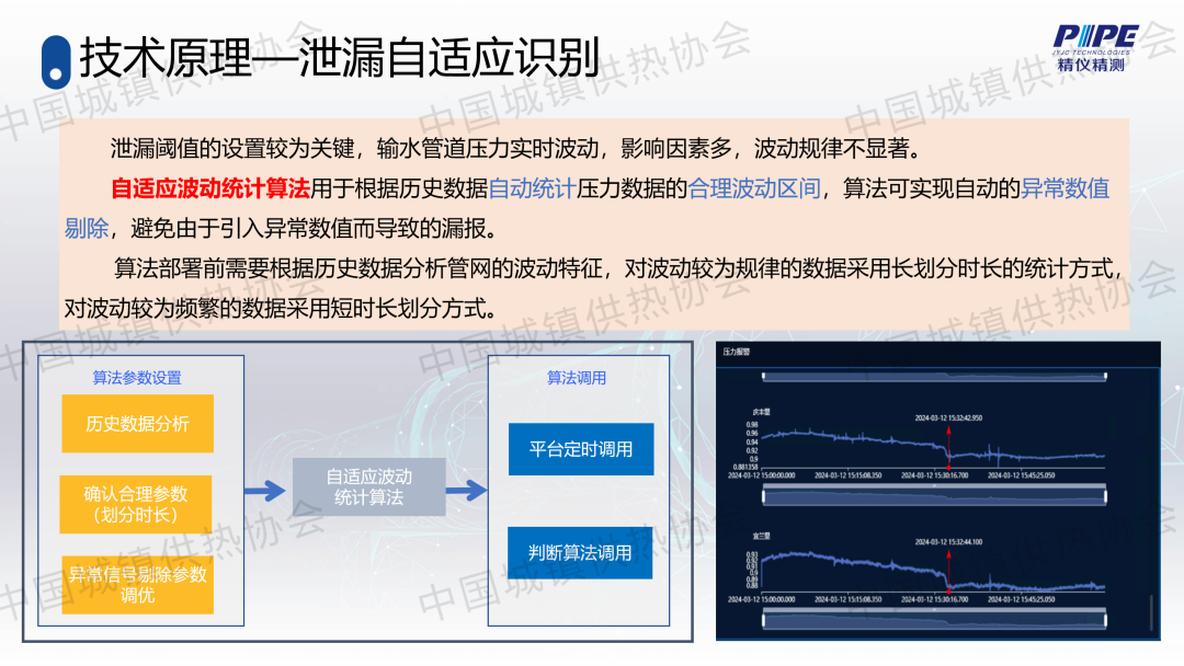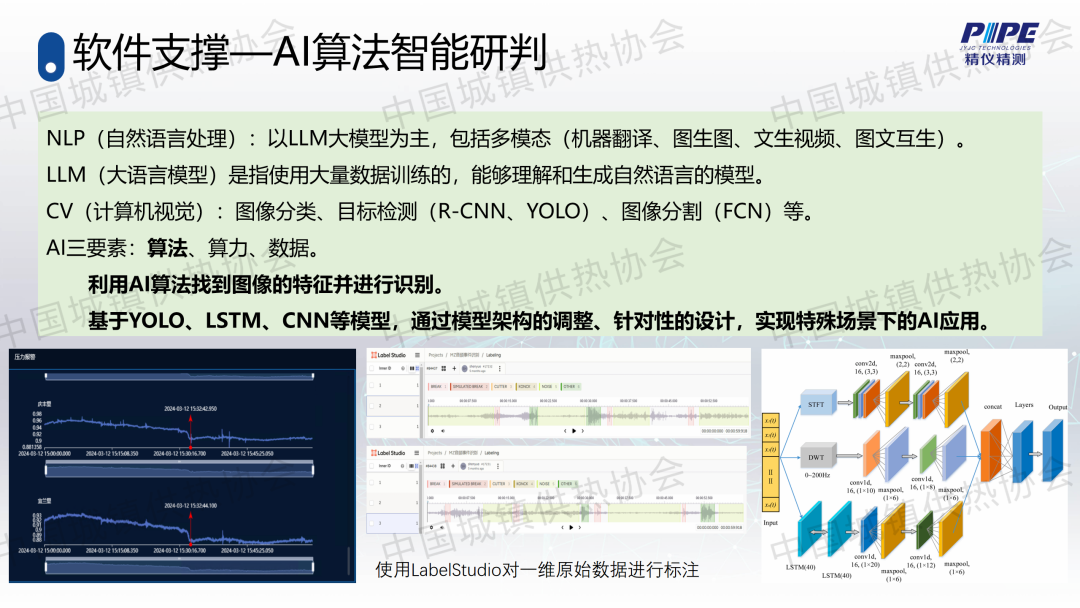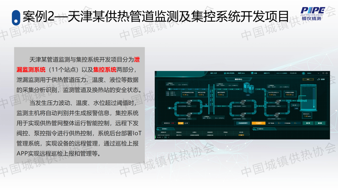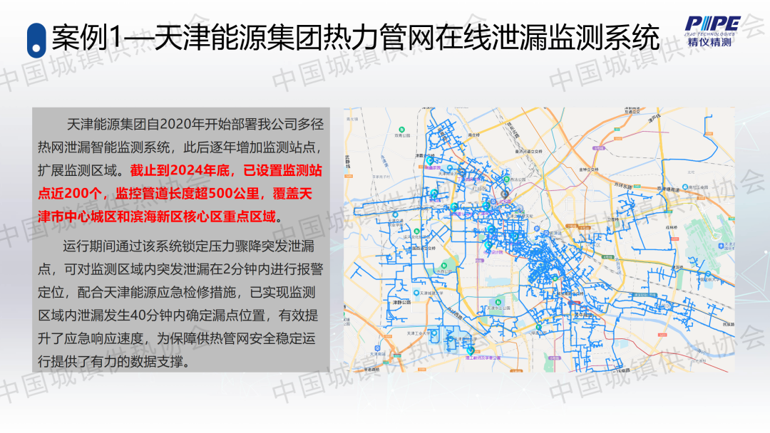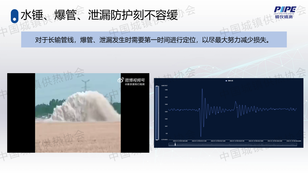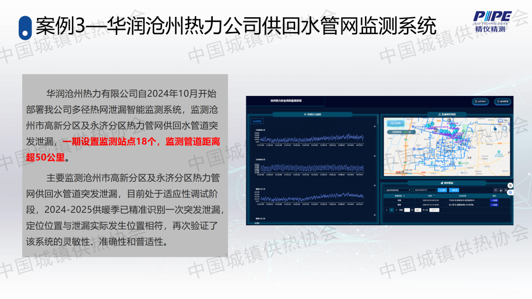 “管道檢漏、監(jiān)測與失水治理”分論壇上,天津精儀精測科技有限公司副總經(jīng)理高潮作了關(guān)于“基于人工智能的一級管網(wǎng)壓力波泄漏監(jiān)測技術(shù)”的主題演講,介紹了管道全生命周期管理及供熱管網(wǎng)爆管、泄漏監(jiān)測與預(yù)警系統(tǒng)的架構(gòu)、技術(shù)原理、關(guān)鍵技術(shù)、技術(shù)指標(biāo)、軟件支撐、硬件支撐等,并分享了相關(guān)應(yīng)用案例。