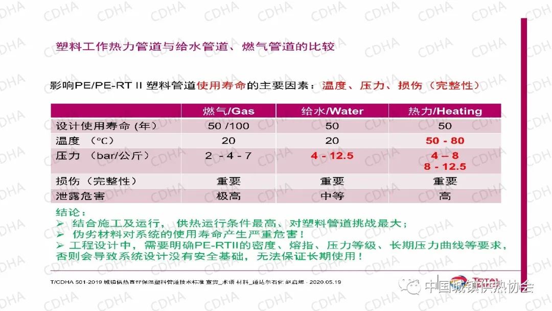 從材料角度說,使用PE材料的燃氣管或者水管,對于供熱管來說,使用條件是最高的,對塑料管挑戰(zhàn)最大。因此工程設計中,要明確PE-RTII的壓力等級。