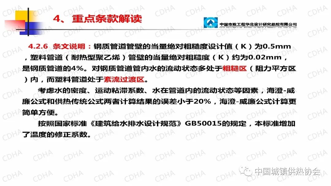 鋼質(zhì)管道和塑料管道的絕對粗糙度是不一樣的,粗糙區(qū)公式較簡單,紊流過渡區(qū)計算公式較復雜,再考慮到水的密度、運動粘滯系數(shù)、誰在管道內(nèi)的流動狀態(tài)等因素,海澄·威廉公式和供熱傳統(tǒng)公式兩者計算結(jié)果的誤差小于20%,同時參照國家標準《建筑給水排水設計規(guī)范》GB50015規(guī)定,增加溫度的修正系數(shù),海澄·威廉公式計算更簡單方便。