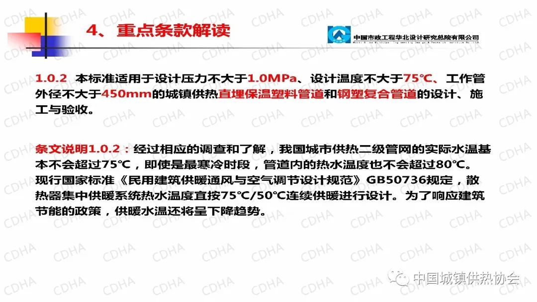 重點強調(diào):本標準適用于設計壓力不大于1.0MPa、設計溫度不大于75℃、工作管外徑不大于450mm的城鎮(zhèn)供熱直埋保溫塑料管道和鋼塑復合管道的設計、施工與驗收。