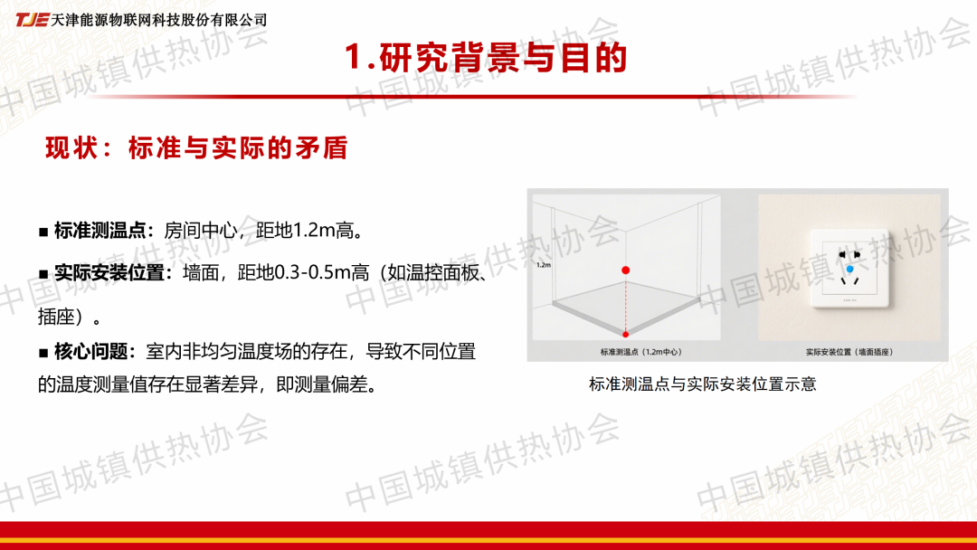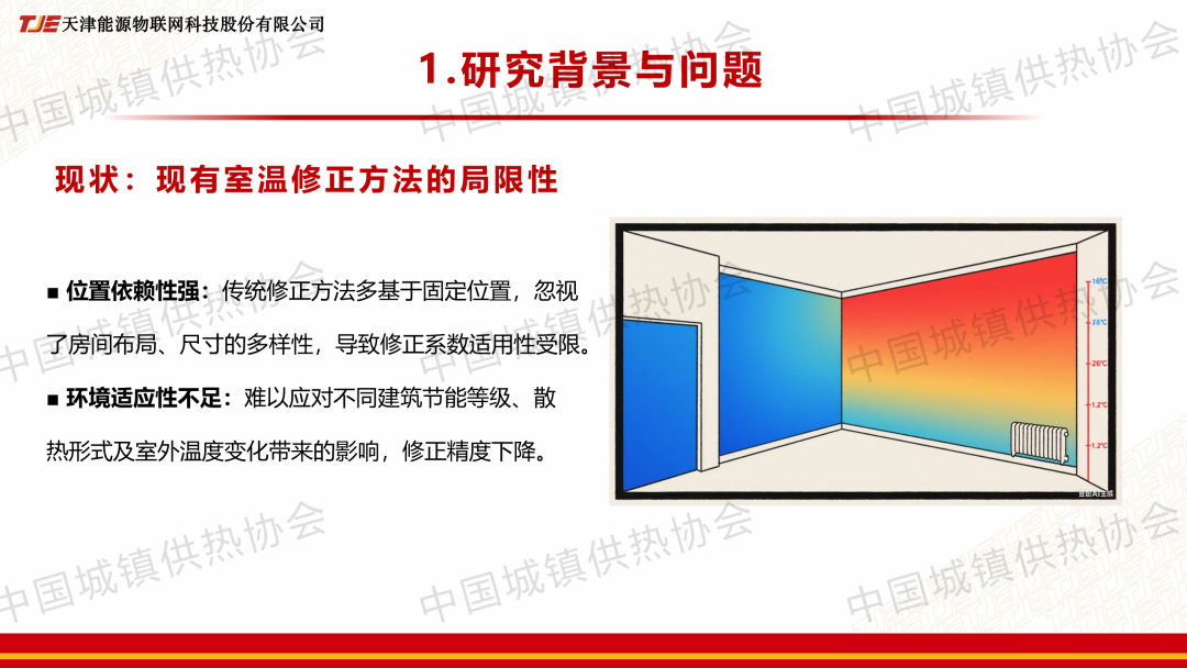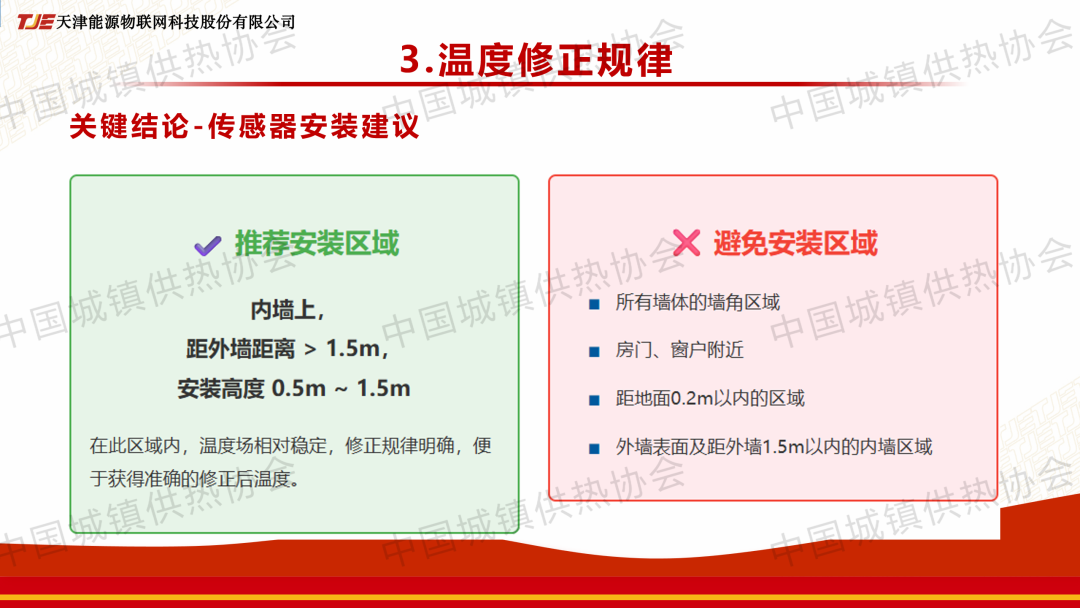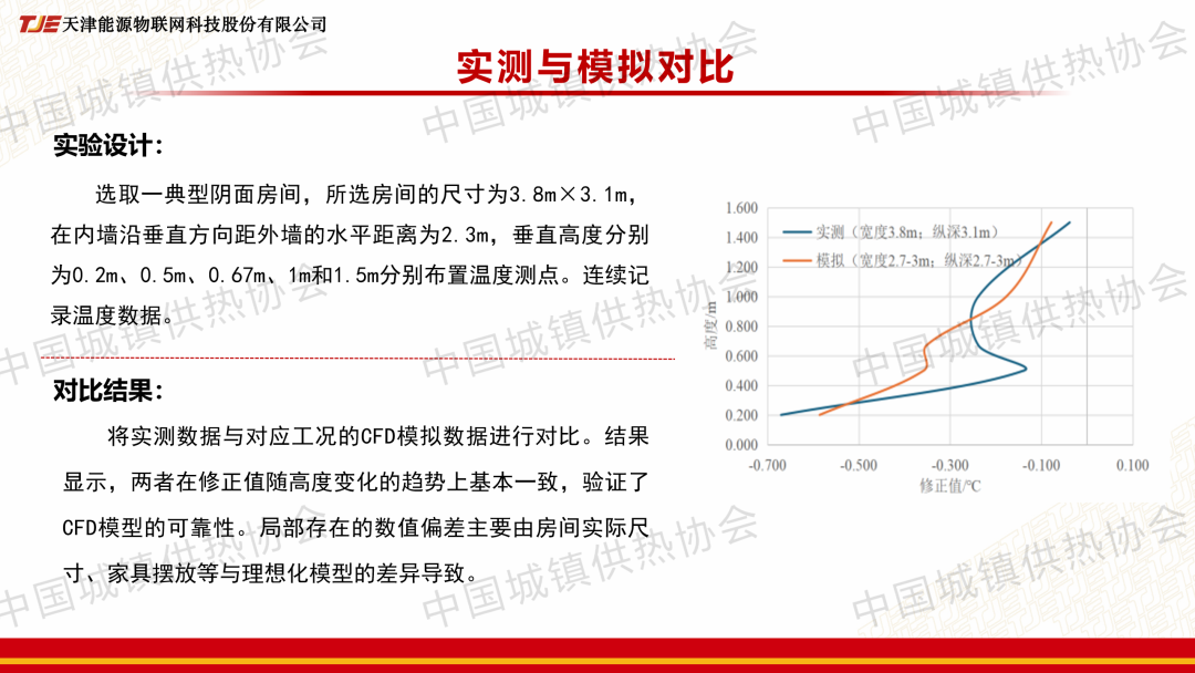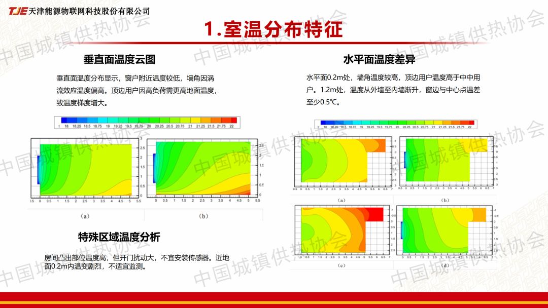 “室溫調(diào)控與末端建筑節(jié)能”分論壇上,趙睿就此論文作了主題演講,系統(tǒng)分析了室內(nèi)溫度場(chǎng)分布特征,明確了垂直方向呈“上熱下冷”的分段變化規(guī)律,水平方向則顯著受外墻距離和墻?氣流的影響,提出了“修正值 = 中心點(diǎn)標(biāo)準(zhǔn)溫度-傳感器實(shí)測(cè)溫度”的計(jì)算方法,并探明了其在不同因素下的變化規(guī)律?;谘芯拷Y(jié)果,給出了科學(xué)、量化的室溫傳感器推薦安裝區(qū)域與應(yīng)避免的區(qū)域。