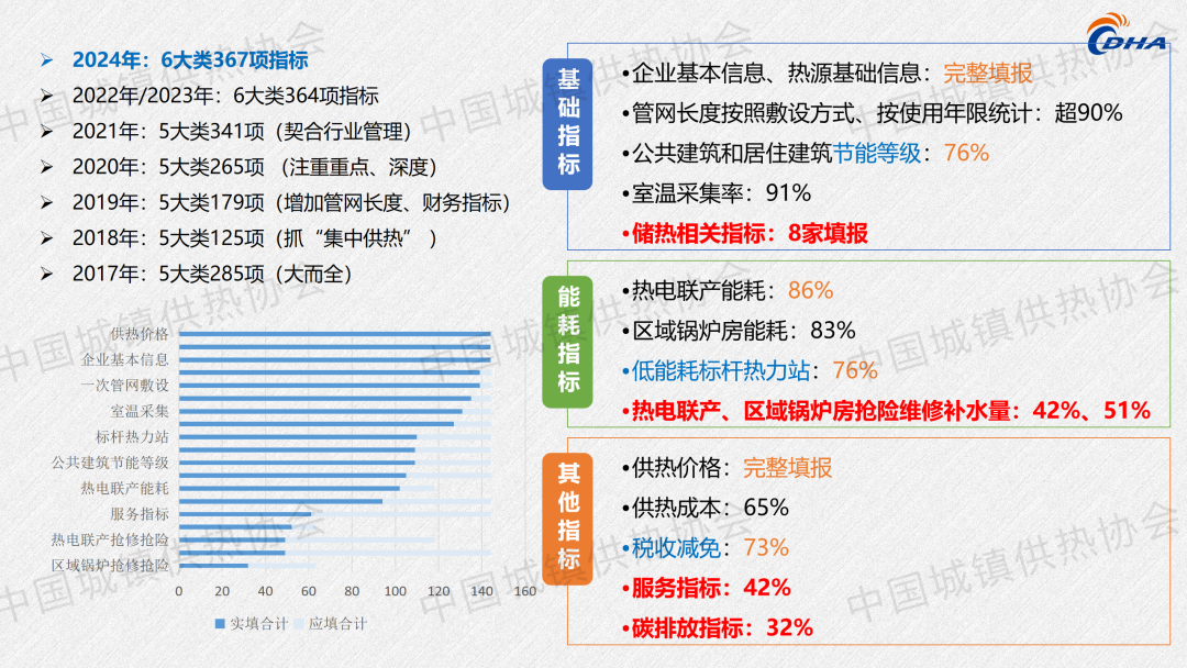 協(xié)會統(tǒng)計工作項目組劉海燕對供熱統(tǒng)計工作進行了梳理與分析,重點解讀了協(xié)會向供熱企業(yè)提供的對標報告。劉海燕介紹到,協(xié)會統(tǒng)計規(guī)模從2017年35家企業(yè)14.4億㎡發(fā)展到2024年144家企業(yè)48.8億㎡,占全國城市集中供熱面積的比例從19.5%發(fā)展到42%。統(tǒng)計指標也在填報過程中根據(jù)行業(yè)需求動態(tài)變化,2024年包括6大類367項。