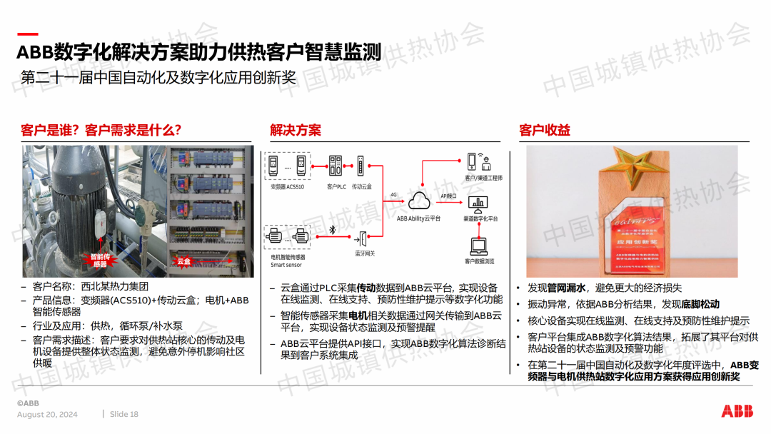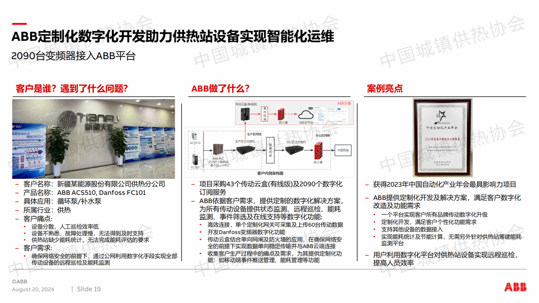 ABB供熱業(yè)務(wù)經(jīng)理孫曄做了題為“ABB變頻器與數(shù)字化為供熱行業(yè)的定制化應(yīng)用”的主題演講,介紹了ABB在供熱行業(yè)的定制化產(chǎn)品、數(shù)字化解決方案以及ABB變頻器在供熱行業(yè)的應(yīng)用。