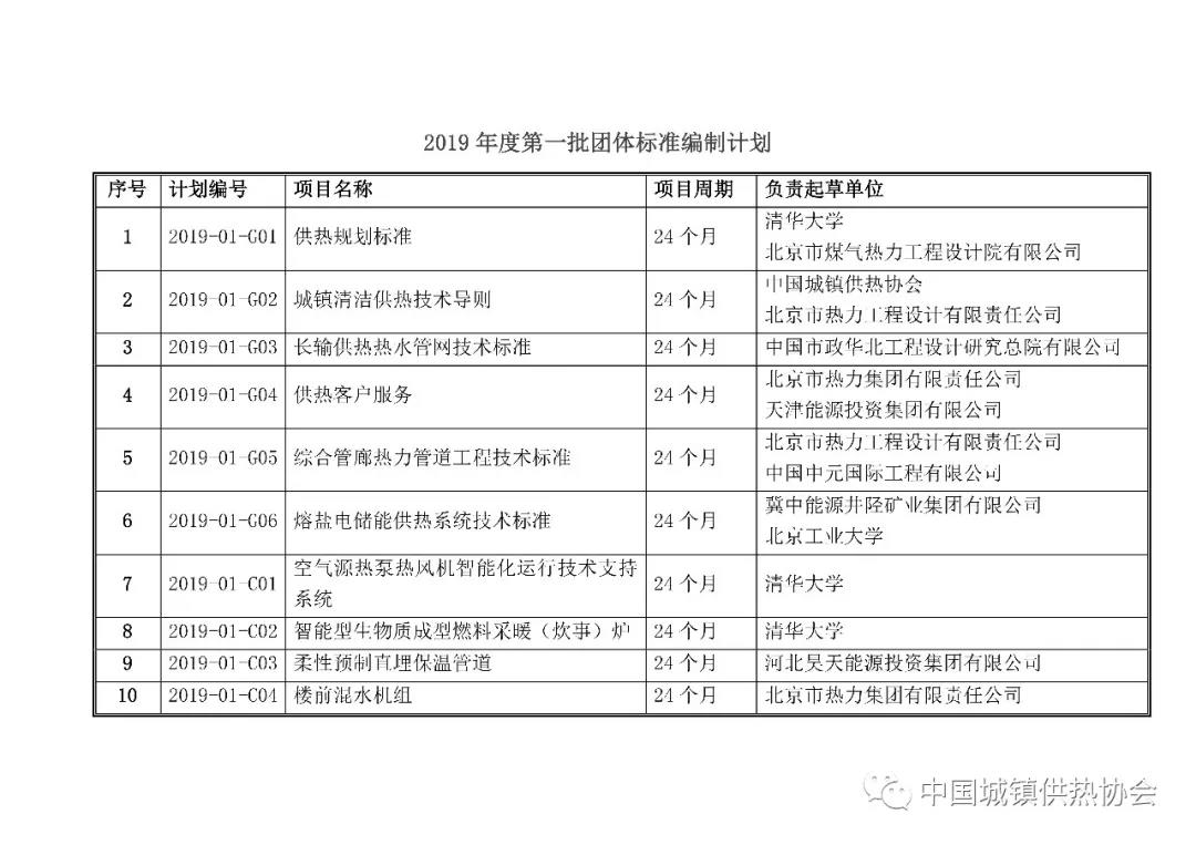 2019年1月,中國城鎮(zhèn)供熱協(xié)會標準化委員會召開了2019年團體標準立項評估會,會上由會員單位提交團體標準申請報告多達30余項,經(jīng)專家評審通過,2019年第一批團體立項標準10項: