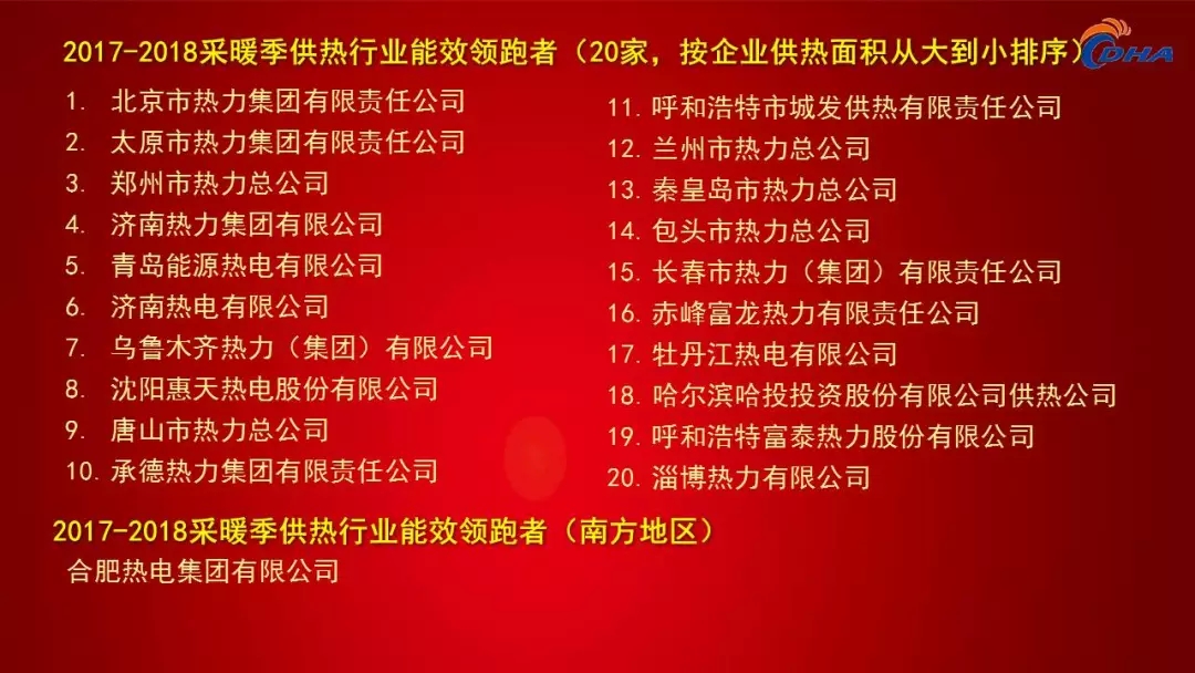 2017-2018采暖季供熱行業(yè)能效領(lǐng)跑者(南方地區(qū))獲獎企業(yè)名單如下: