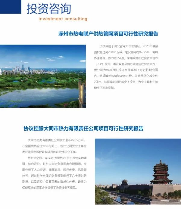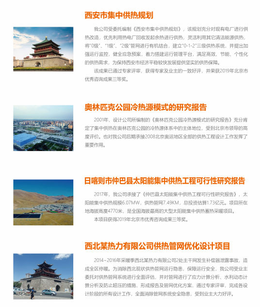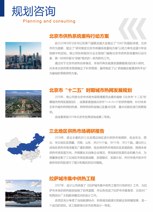 立足北京,面向全國,公司的工程項目遍及內(nèi)蒙古、西藏、遼寧等近二十個省、市、自治區(qū)。在全國業(yè)界,公司是熱力行業(yè)國家標(biāo)準(zhǔn)、規(guī)范、圖集的重要編制單位、供熱技術(shù)進步的重要推動者,為各地政府和供熱企業(yè)提供咨詢設(shè)計服務(wù)。