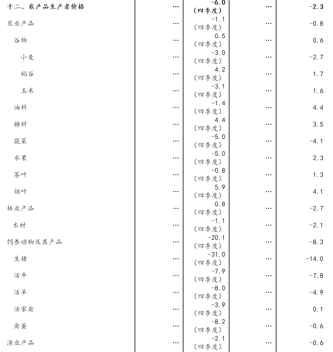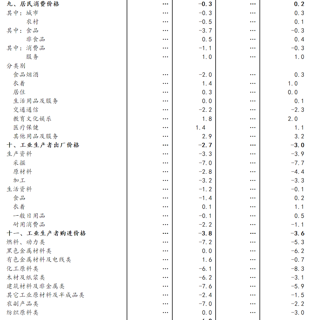 全年居民消費(fèi)價(jià)格(CPI)比上年上漲0.2%。分類別看,食品煙酒價(jià)格上漲0.3%,衣著價(jià)格上漲1.0%,居住價(jià)格持平,生活用品及服務(wù)價(jià)格上漲0.1%,交通通信價(jià)格下降2.3%,教育文化娛樂價(jià)格上漲2.0%,醫(yī)療保健價(jià)格上漲1.1%,其他用品及服務(wù)價(jià)格上漲3.2%。在食品煙酒價(jià)格中,豬肉價(jià)格下降13.6%,鮮菜價(jià)格下降2.6%,糧食價(jià)格上漲1.0%,鮮果價(jià)格上漲4.9%??鄢称泛湍茉磧r(jià)格后的核心CPI上漲0.7%。12月份,居民消費(fèi)價(jià)格同比下降0.3%,環(huán)比上漲0.1%。全年工業(yè)生產(chǎn)者出廠價(jià)格比上年下降3.0%;12月份同比下降2.7%,環(huán)比下降0.3%。全年工業(yè)生產(chǎn)者購(gòu)進(jìn)價(jià)格比上年下降3.6%;12月份同比下降3.8%,環(huán)比下降0.2%。