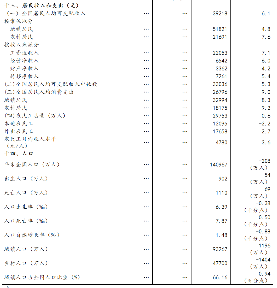 年末全國(guó)人口(包括31個(gè)省、自治區(qū)、直轄市和現(xiàn)役軍人的人口,不包括居住在31個(gè)省、自治區(qū)、直轄市的港澳臺(tái)居民和外籍人員)140967萬(wàn)人,比上年末減少208萬(wàn)人。全年出生人口902萬(wàn)人,人口出生率為6.39‰;死亡人口1110萬(wàn)人,人口死亡率為7.87‰;人口自然增長(zhǎng)率為-1.48‰。從性別構(gòu)成看,男性人口72032萬(wàn)人,女性人口68935萬(wàn)人,總?cè)丝谛詣e比為104.49(以女性為100)。從年齡構(gòu)成看,16—59歲的勞動(dòng)年齡人口86481萬(wàn)人,占全國(guó)人口的比重為61.3%;60歲及以上人口29697萬(wàn)人,占全國(guó)人口的21.1%,其中65歲及以上人口21676萬(wàn)人,占全國(guó)人口的15.4%。從城鄉(xiāng)構(gòu)成看,城鎮(zhèn)常住人口93267萬(wàn)人,比上年末增加1196萬(wàn)人;鄉(xiāng)村常住人口47700萬(wàn)人,減少1404萬(wàn)人;城鎮(zhèn)人口占全國(guó)人口的比重(城鎮(zhèn)化率)為66.16%,比上年末提高0.94個(gè)百分點(diǎn)。