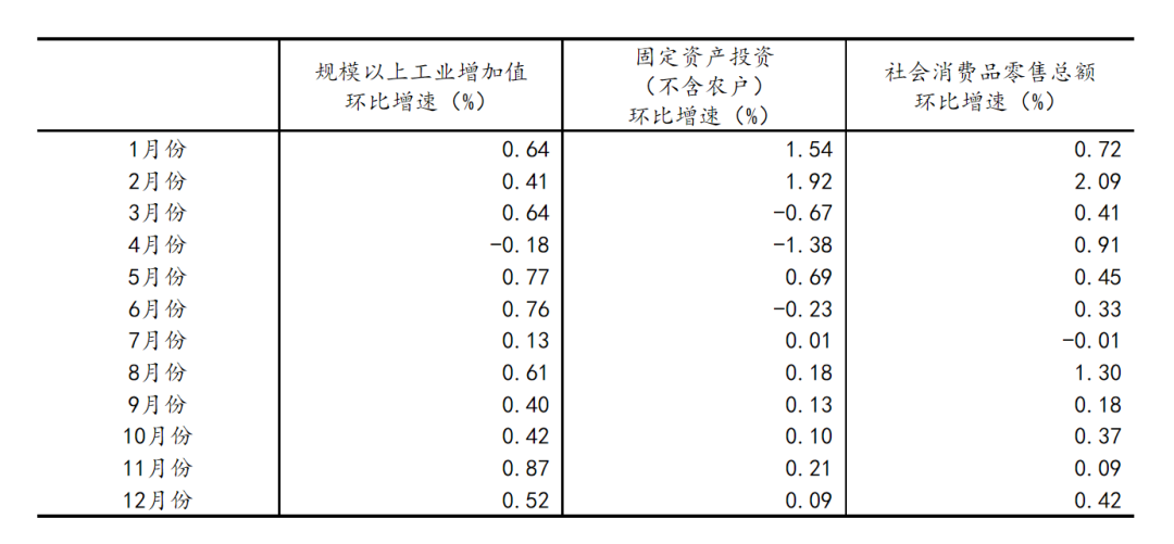 (2)根據(jù)季節(jié)調(diào)整模型自動(dòng)修正結(jié)果,對(duì)近一年來(lái)各期國(guó)內(nèi)生產(chǎn)總值、規(guī)模以上工業(yè)增加值、固定資產(chǎn)投資(不含農(nóng)戶)、社會(huì)消費(fèi)品零售總額環(huán)比增速進(jìn)行修訂。修訂結(jié)果及2023年四季度GDP環(huán)比數(shù)據(jù)、2023年12月份其他指標(biāo)環(huán)比數(shù)據(jù)如下: