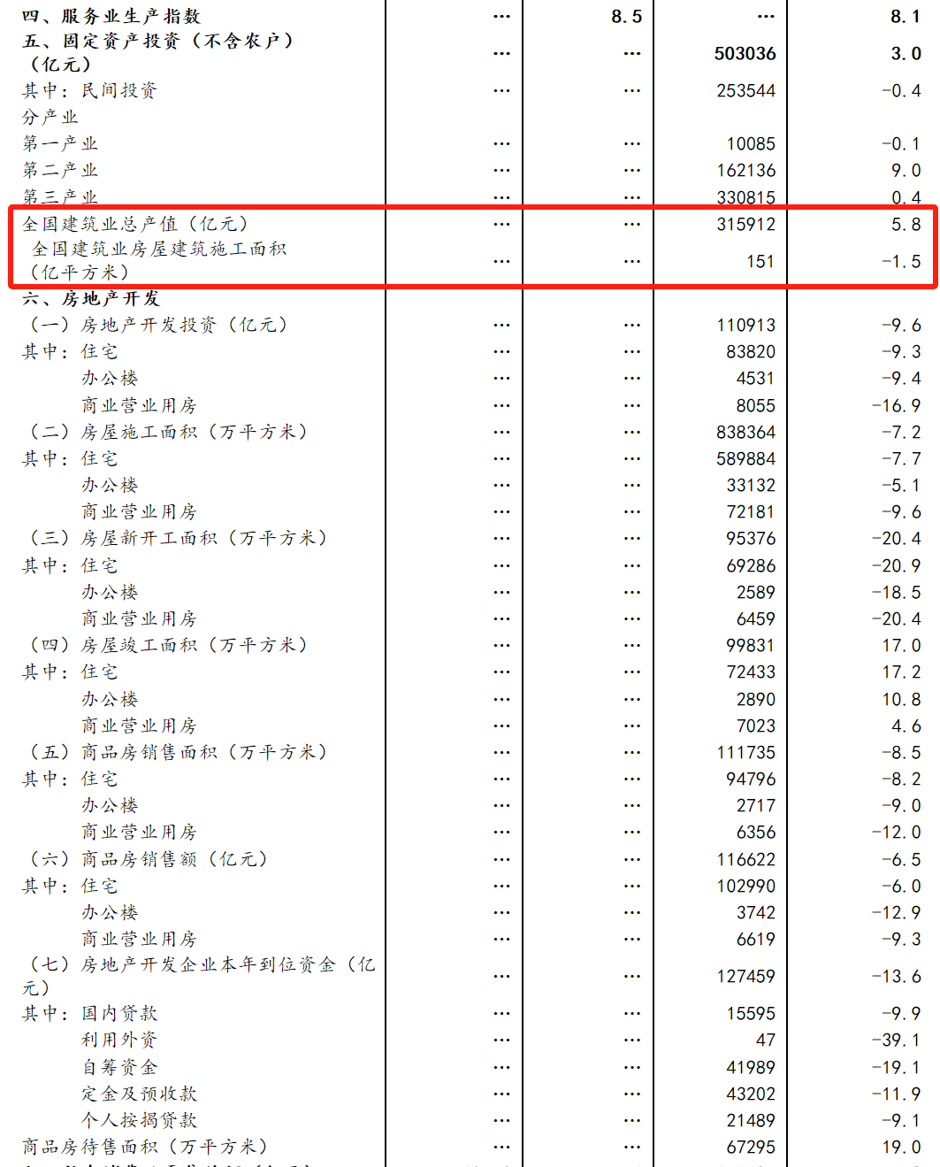 數(shù)據(jù)顯示,2023年全國(guó)建筑業(yè)總產(chǎn)值315912億元,同比增長(zhǎng)5.8%。全國(guó)建筑業(yè)房屋建筑施工面積151億平方米,同比減少1.5%。全年全國(guó)規(guī)模以上工業(yè)增加值比上年增長(zhǎng)4.6%。分三大門類看,其中電力、熱力、燃?xì)饧八a(chǎn)和供應(yīng)業(yè)增長(zhǎng)4.3%。