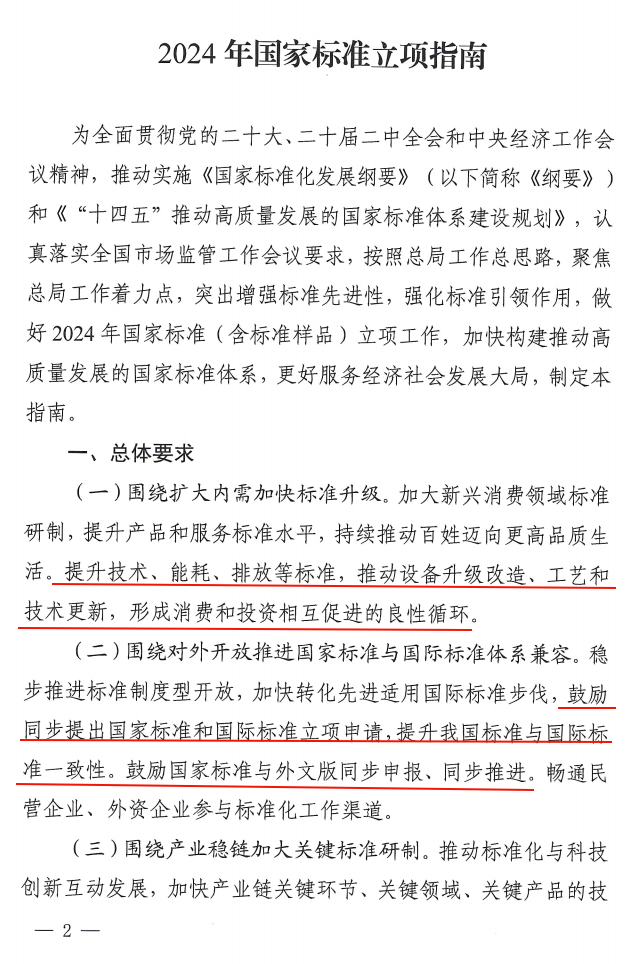 2024年1月12日,國家標準化管理委員會發(fā)布關于印發(fā)《2024年國家標準立項指南》的通知,重點支持節(jié)能減污領域、綠色低碳領域、裝備制造領域、新興技術領域等多個領域標準制定。