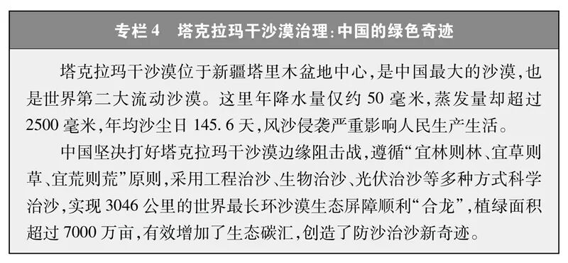 中國堅持系統(tǒng)觀念,推進(jìn)山水林田湖草沙一體化保護(hù)和系統(tǒng)治理,生態(tài)系統(tǒng)碳匯能力持續(xù)增強(qiáng),在世界范圍內(nèi)率先實(shí)現(xiàn)土地退化“零增長”、荒漠化土地和沙化土地面積“雙減少”,近20年來為全球貢獻(xiàn)了約四分之一的新增綠化面積。