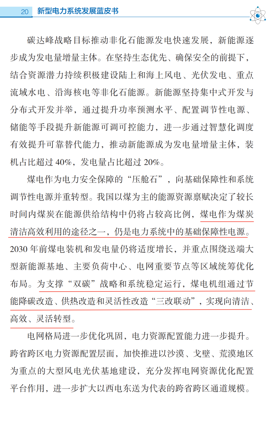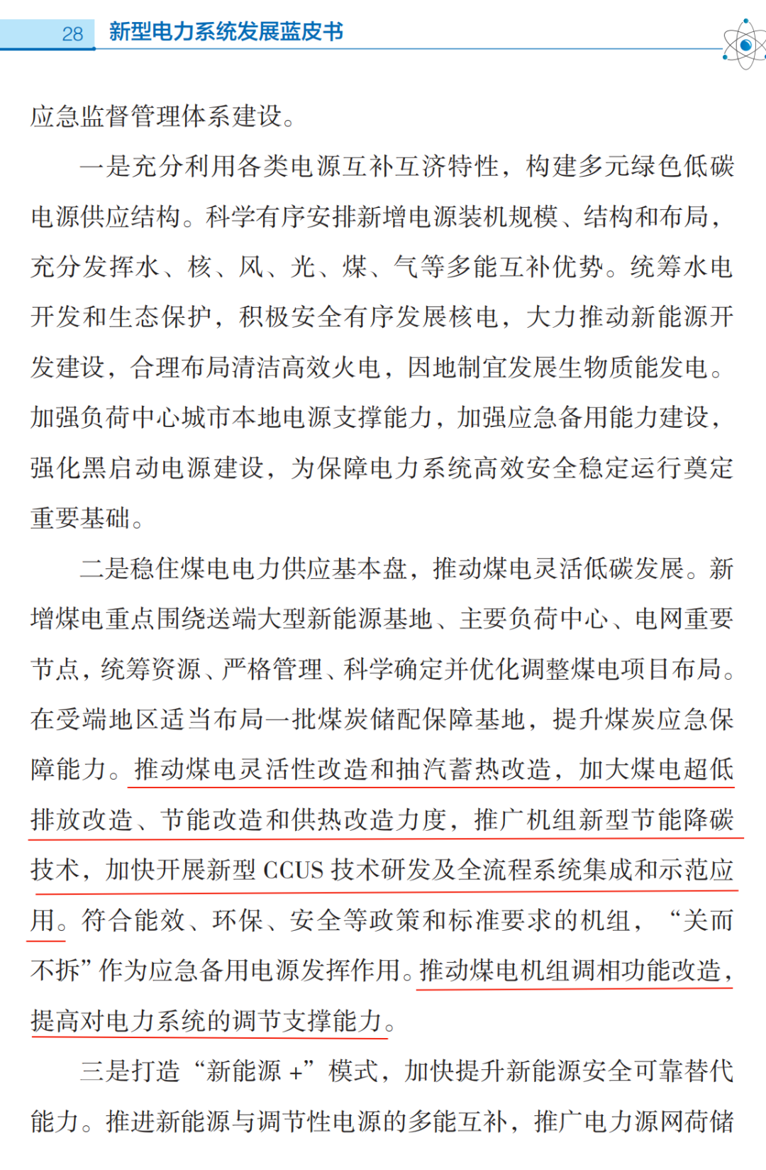 《藍(lán)皮書》提出,推動(dòng)煤電靈活性改造和抽汽蓄熱改造,加大煤電超低排放改造、節(jié)能改造和供熱改造力度,推廣機(jī)組新型節(jié)能降碳技術(shù),加快開展新型CCUS技術(shù)研發(fā)及全流程系統(tǒng)集成和示范應(yīng)用。為支撐“雙碳”戰(zhàn)略和系統(tǒng)穩(wěn)定運(yùn)行,煤電機(jī)組通過節(jié)能降碳改造、供熱改造和靈活性改造“三改聯(lián)動(dòng)”,實(shí)現(xiàn)向清潔、高效、靈活轉(zhuǎn)型。
