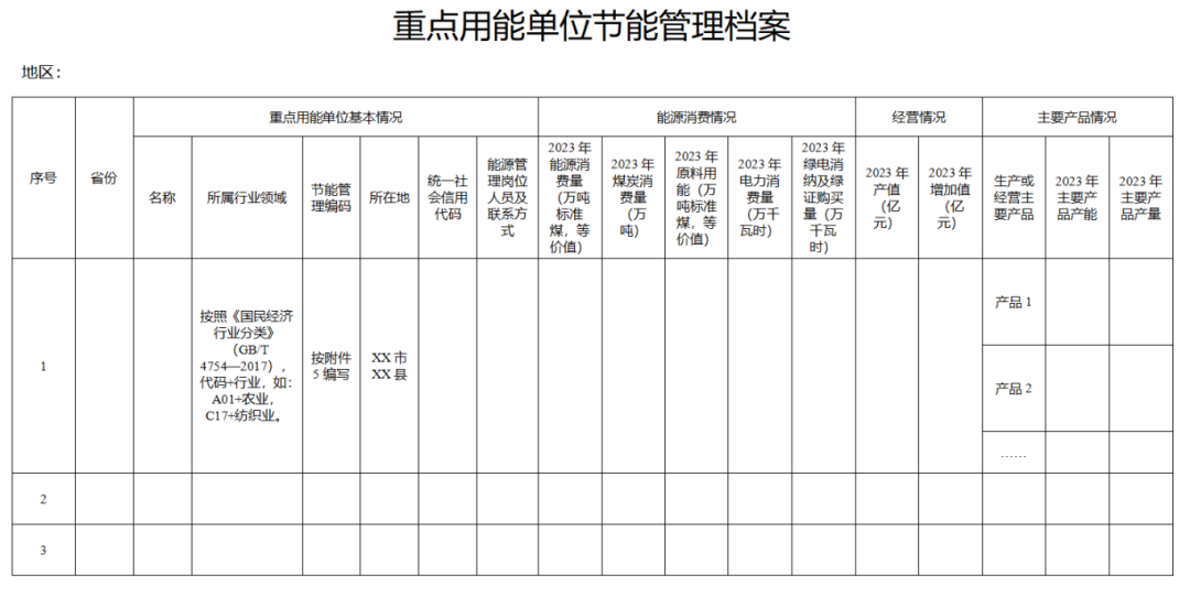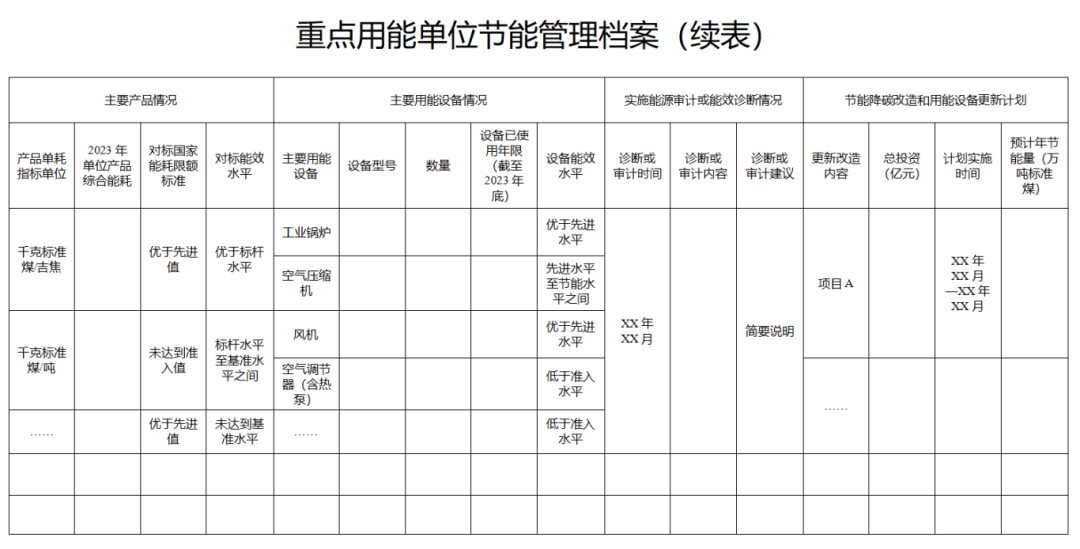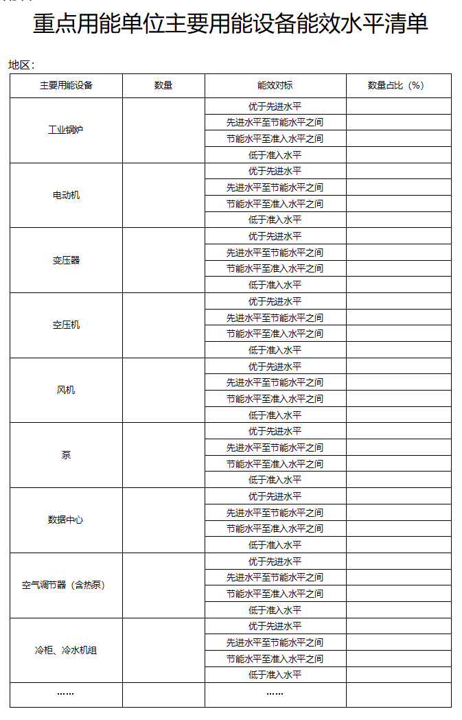 (二)明確工作時(shí)限。2024年8月底前,各地區(qū)建立年綜合能耗5萬(wàn)噸標(biāo)準(zhǔn)煤及以上重點(diǎn)用能單位節(jié)能管理檔案,并完成相應(yīng)單位及其主要用能設(shè)備能效水平摸排。2024年12月底前,各地區(qū)建立年綜合能耗1萬(wàn)噸標(biāo)準(zhǔn)煤及以上重點(diǎn)用能單位節(jié)能管理檔案,并完成相應(yīng)單位及其主要用能設(shè)備能效水平摸排。各地區(qū)重點(diǎn)用能單位節(jié)能管理檔案按年度實(shí)行動(dòng)態(tài)更新。