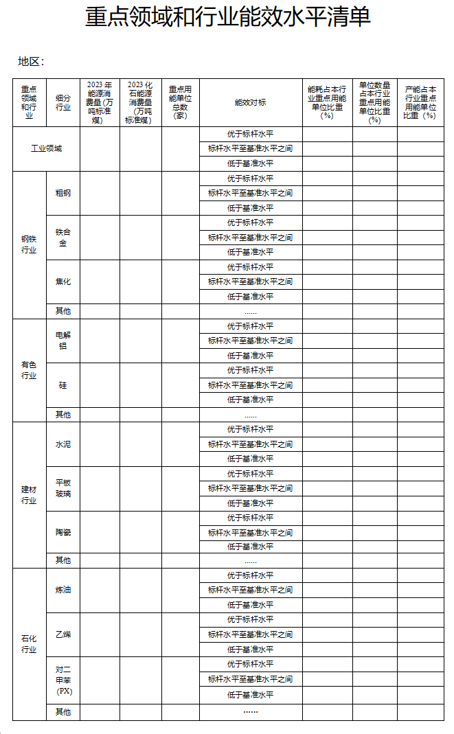 (二)摸排重點(diǎn)領(lǐng)域和行業(yè)能效水平。對(duì)標(biāo)能耗限額強(qiáng)制性國(guó)家標(biāo)準(zhǔn)和《工業(yè)重點(diǎn)領(lǐng)域能效標(biāo)桿水平和基準(zhǔn)水平(2023年版)》《煤炭清潔高效利用重點(diǎn)領(lǐng)域標(biāo)桿和基準(zhǔn)水平(2022年版)》《公共建筑節(jié)能設(shè)計(jì)標(biāo)準(zhǔn)》《公共機(jī)構(gòu)能耗定額標(biāo)準(zhǔn)》等標(biāo)準(zhǔn)及政策要求,摸排本地區(qū)工業(yè)、建筑、交通、公共機(jī)構(gòu)等重點(diǎn)領(lǐng)域,以及鋼鐵、有色、建材、石化、化工、數(shù)據(jù)中心等重點(diǎn)行業(yè)能效水平,查找能源利用薄弱環(huán)節(jié)和突出問(wèn)題。