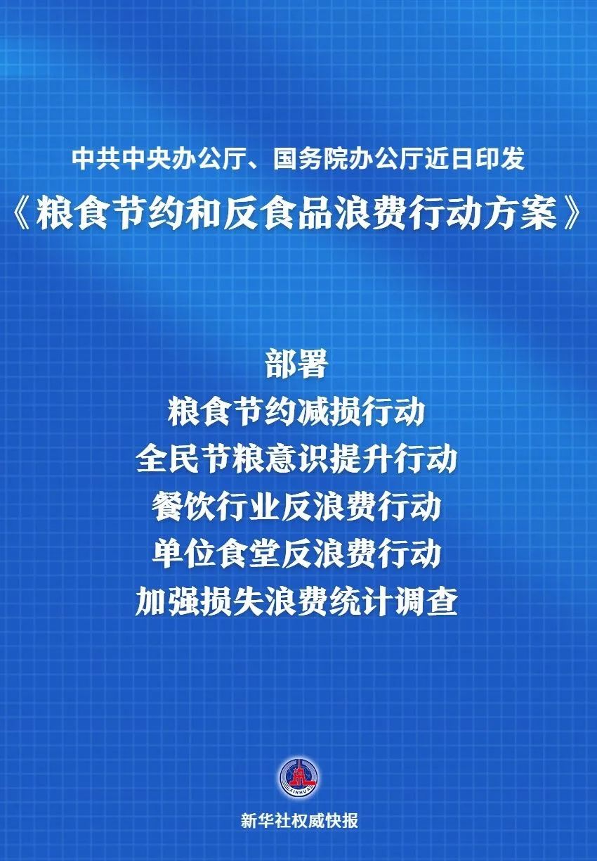 近日,中共中央辦公廳、國務(wù)院辦公廳印發(fā)了《糧食節(jié)約和反食品浪費(fèi)行動(dòng)方案》,并發(fā)出通知,要求各地區(qū)各部門結(jié)合實(shí)際認(rèn)真貫徹落實(shí)。