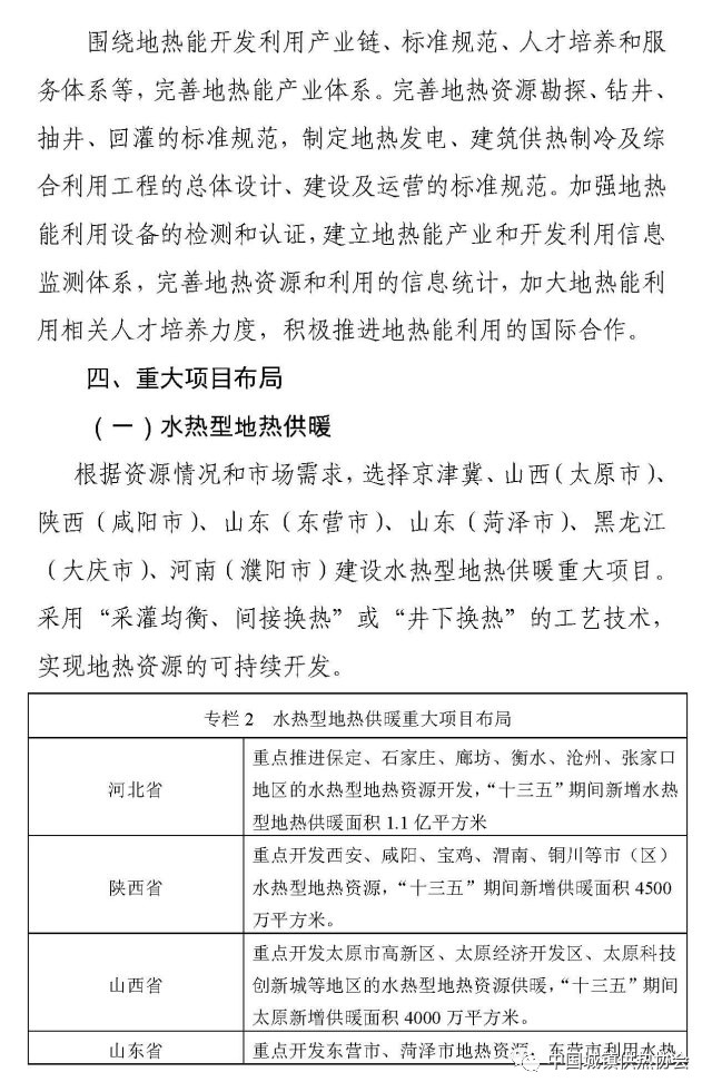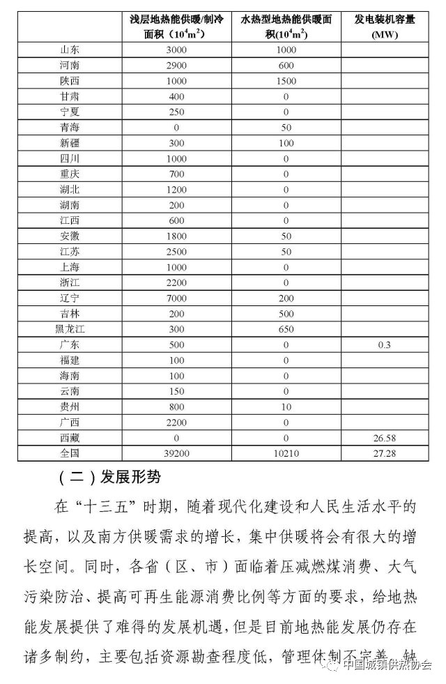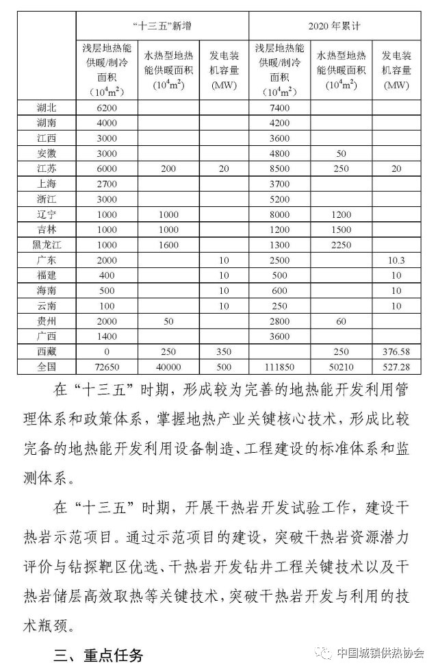 在“十三五”時期,新增地?zé)崮芄┡ㄖ评洌┟娣e11億平方米,其中:新增淺層地?zé)崮芄┡ㄖ评洌┟娣e7億平方米;新增水熱型地?zé)峁┡娣e4億平方米。新增地?zé)岚l(fā)電裝機容量500MW。