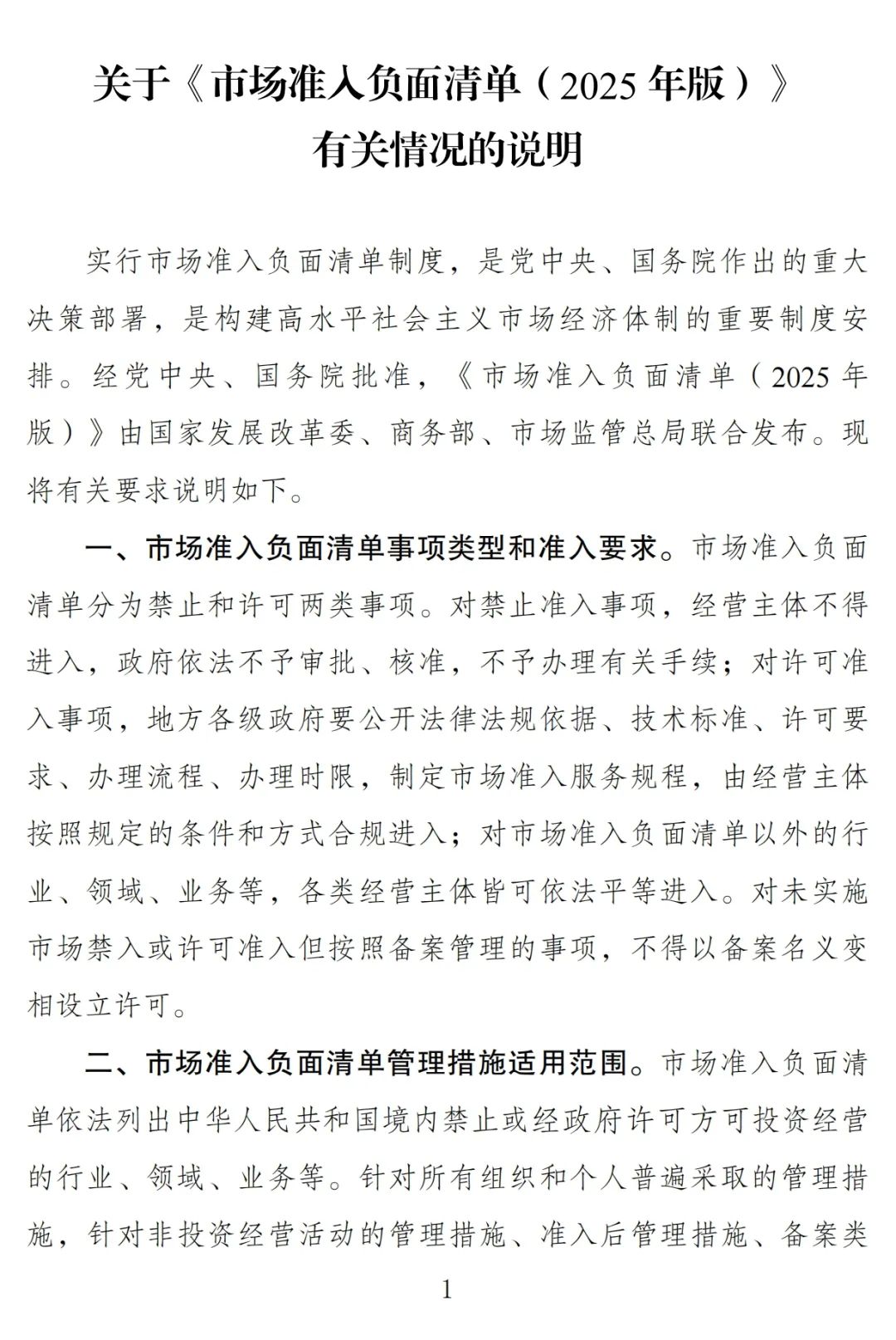 《市場準入負面清單(2025年版)》已經(jīng)黨中央、國務(wù)院批準,自即日起印發(fā)實施,請結(jié)合實際認真貫徹落實。2022年3月12日發(fā)布的《市場準入負面清單(2022年版)》(發(fā)改體改規(guī)〔2022〕397號)同時廢止。