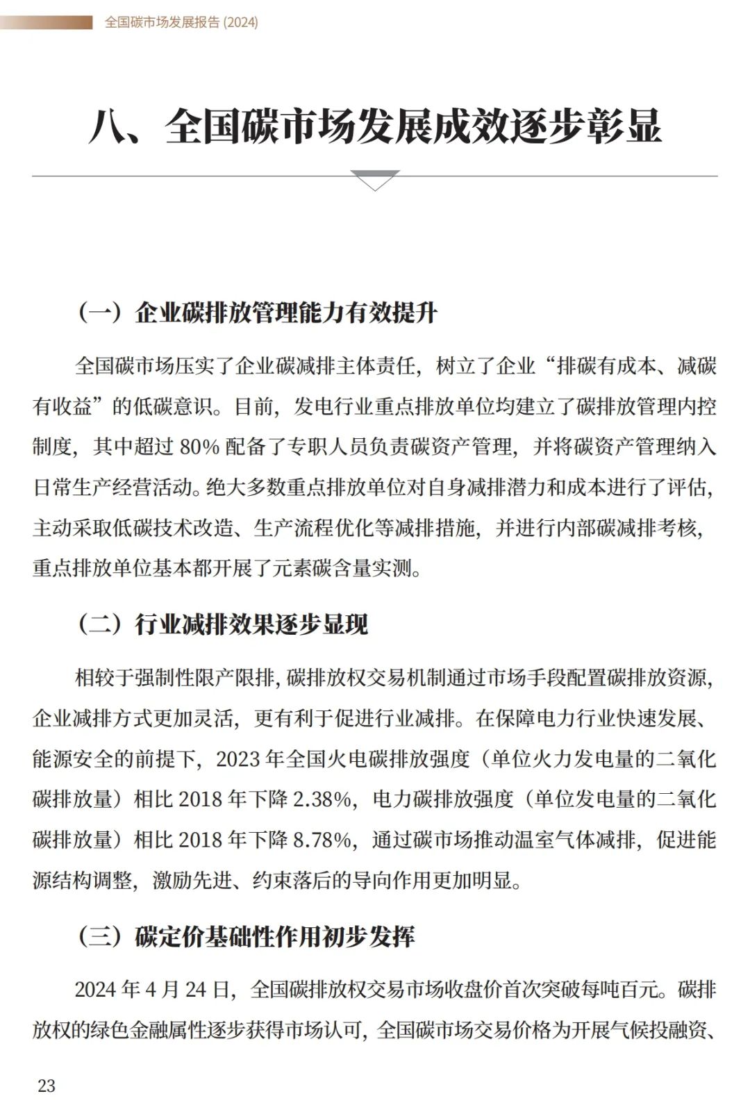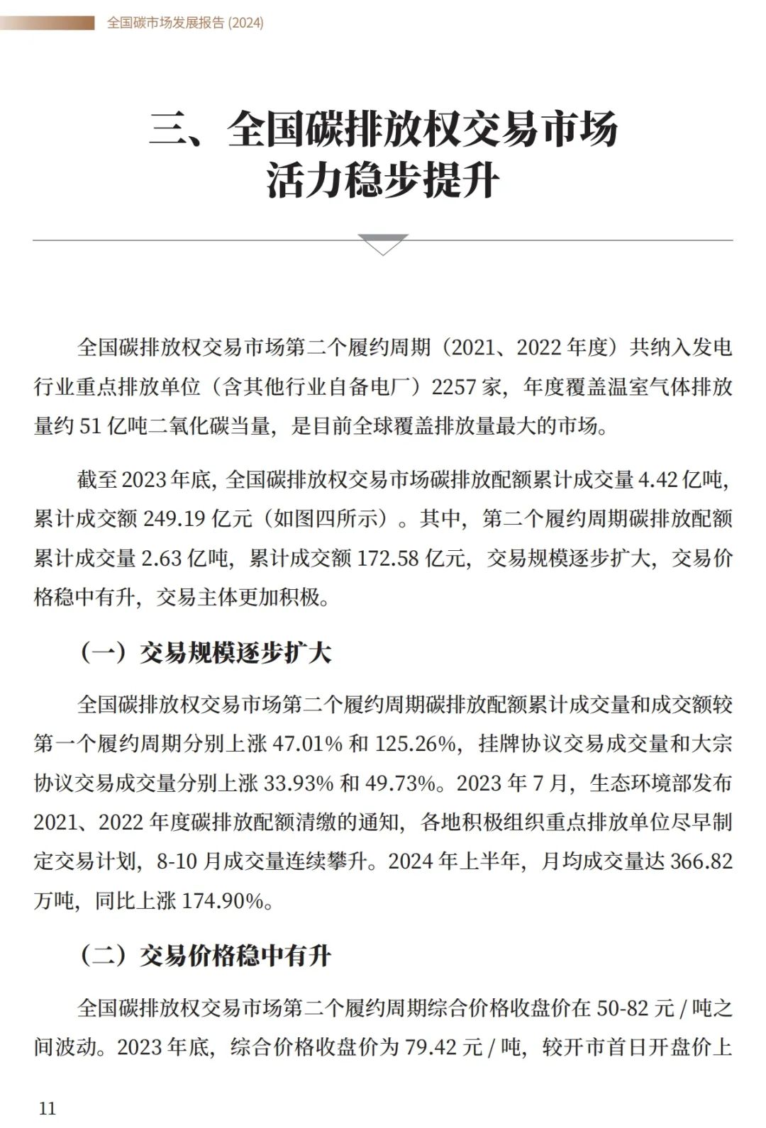 截至2023年底,全國碳排放權(quán)交易市場碳排放配額累計(jì)成交量4.42億噸,累計(jì)成交額 249.19 億元。其中,第二個(gè)履約周期碳排放配額累計(jì)成交量2.63億噸,累計(jì)成交額172.58 億元,交易規(guī)模逐步擴(kuò)大,交易價(jià)格穩(wěn)中有升,交易主體更加積極。