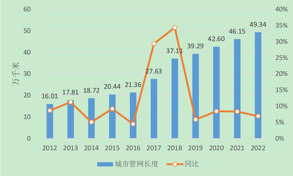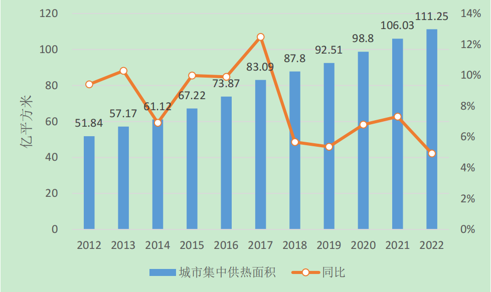 數(shù)據(jù)顯示,截止2022年底全國集中供熱面積達(dá)約137.8億平方米,較2021年增長約6.9億平方米,增長率約5.2%;其中城市集中供熱面積為111.25億平方米,縣城集中供熱面積為20.86億平方米,建制鎮(zhèn)、鄉(xiāng)、鎮(zhèn)鄉(xiāng)級(jí)特殊區(qū)域共約5.69億平方米。全國管道長度達(dá)590657公里,較2021年增長39890公里,增長率約7.2%。