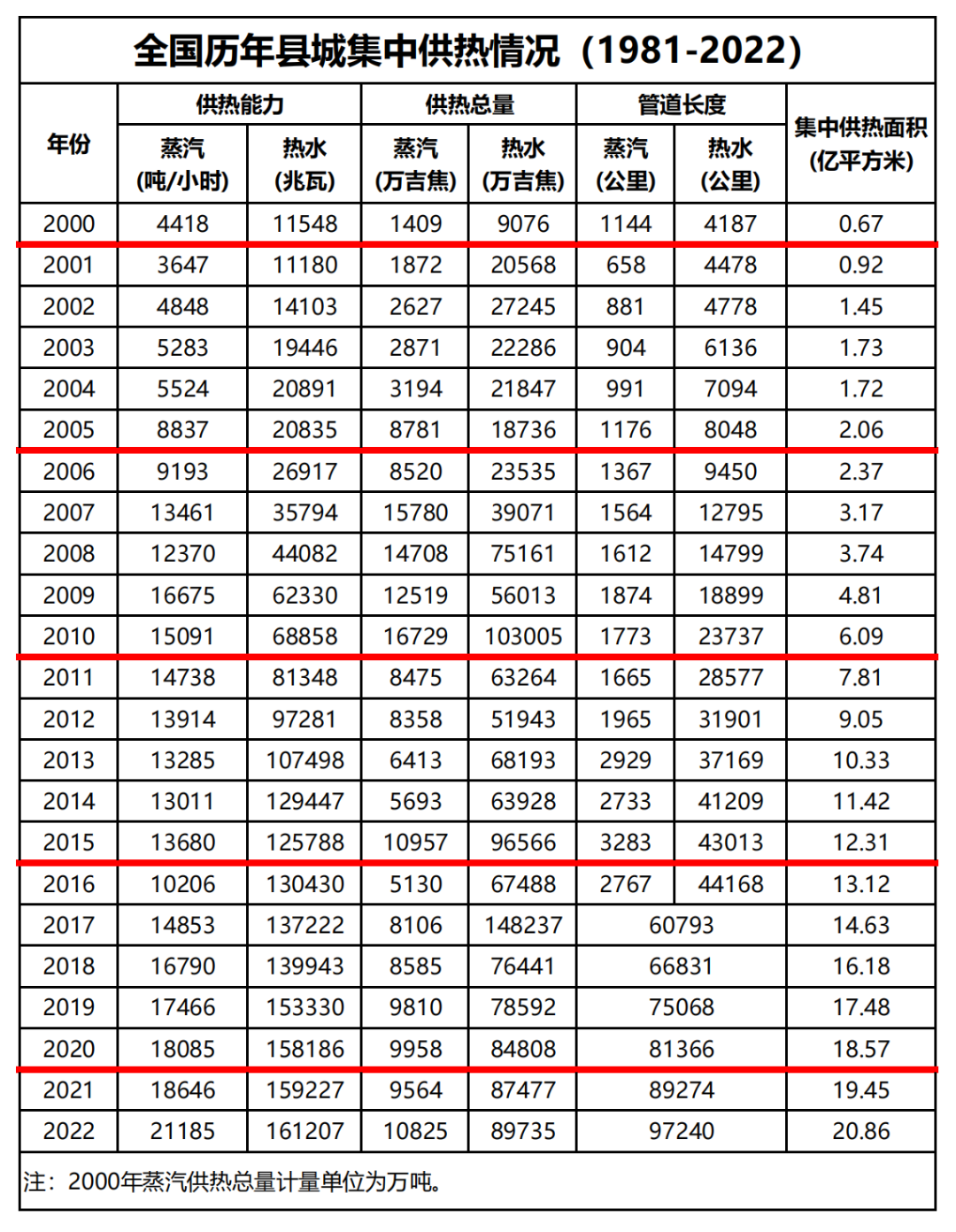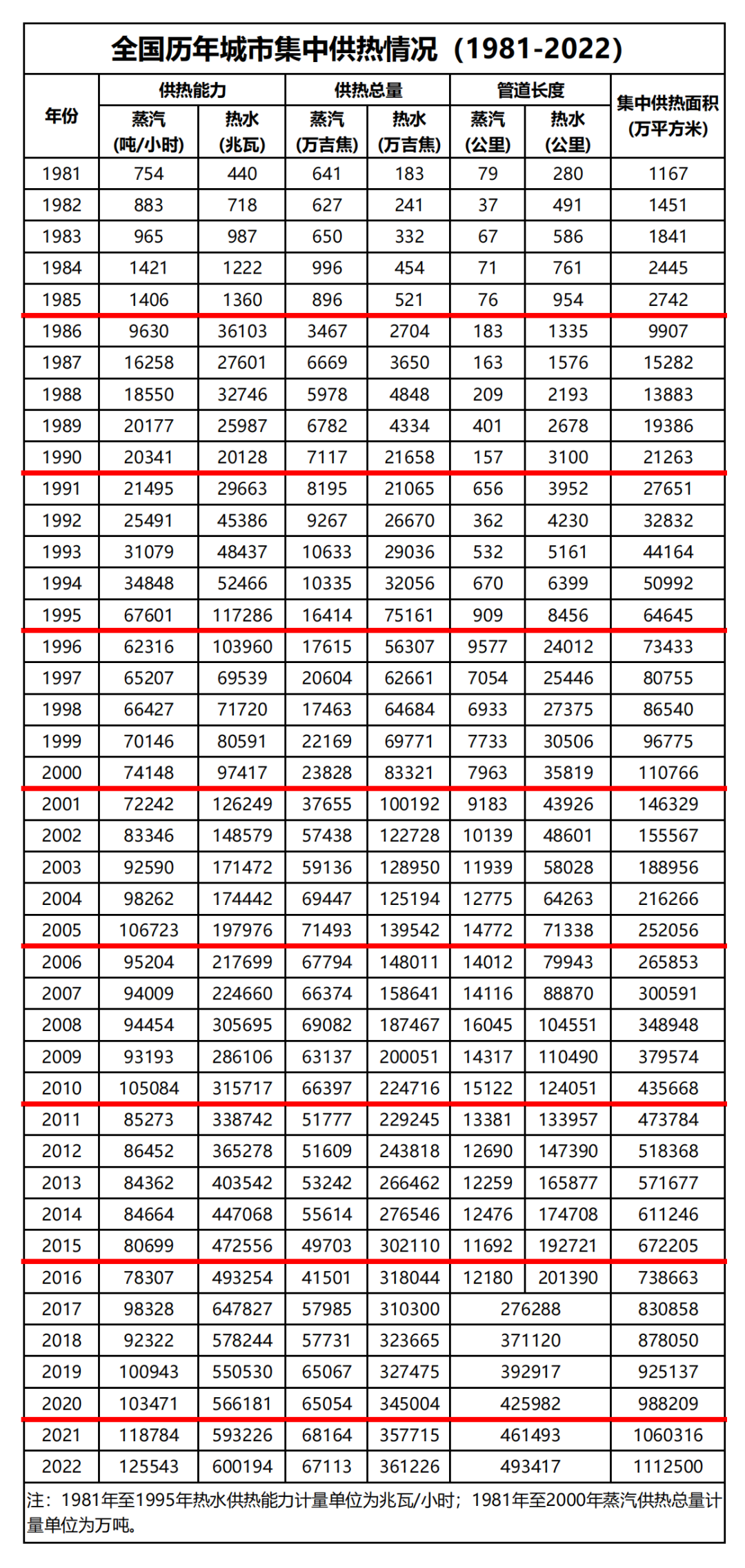 2023年10月13日,住房和城鄉(xiāng)建設(shè)部發(fā)布《2022年城市建設(shè)統(tǒng)計(jì)年鑒》和《2022年城鄉(xiāng)建設(shè)統(tǒng)計(jì)年鑒》,公布了1981年至2022年全國歷年城市集中供熱情況以及2000年至2020年全國歷年縣城集中供熱情況。