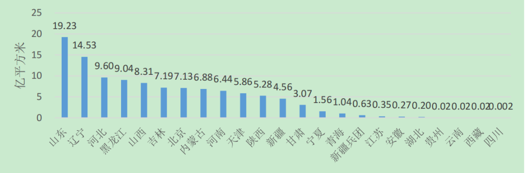 從行政分區(qū)看,山東和遼寧城市集中供熱面積超過10億平方米;河北、黑龍江、山西、吉林、北京、內(nèi)蒙古、河南、天津和陜西8個(gè)?。▍^(qū)、市)超過5億平方米;新疆、甘肅、寧夏和青海5個(gè)?。▍^(qū))超過1億平方米;江蘇、安徽、湖北、貴州、云南、西藏、四川7個(gè)?。▍^(qū))和新疆兵團(tuán)不足1億平方米;上海、浙江、江西、湖南、廣西、福建、廣東、海南和重慶9個(gè)省(區(qū)、市)無集中供熱面積。
