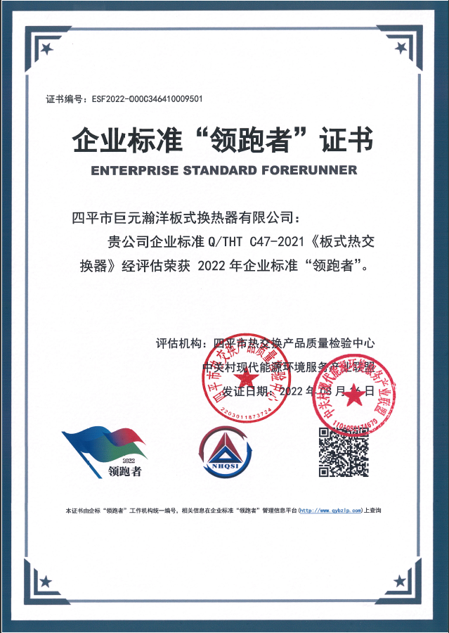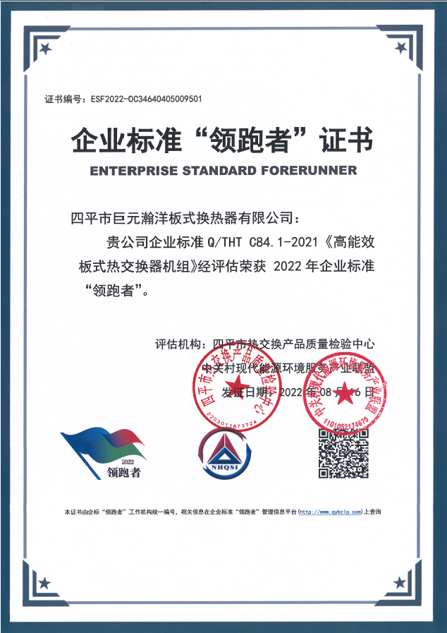 THT巨元企業(yè)標(biāo)準(zhǔn)Q/THT C47—2021《板式熱交換器》與Q/THT C84.1—2021《高能效板式熱交換器機(jī)組》雙雙榮獲2022年企業(yè)標(biāo)準(zhǔn)“領(lǐng)跑者”。其中《板式熱交換器》已經(jīng)連續(xù)四年登上“企業(yè)標(biāo)準(zhǔn)領(lǐng)跑者”榜單,《高能效板式熱交換器機(jī)組》連續(xù)兩年保持領(lǐng)跑。THT巨元《板式熱交換器》標(biāo)準(zhǔn)被吉林省標(biāo)準(zhǔn)研究院評(píng)定為“國際先進(jìn)水平”,并獲得2022年“第五屆吉林省標(biāo)準(zhǔn)創(chuàng)新貢獻(xiàn)獎(jiǎng)”。