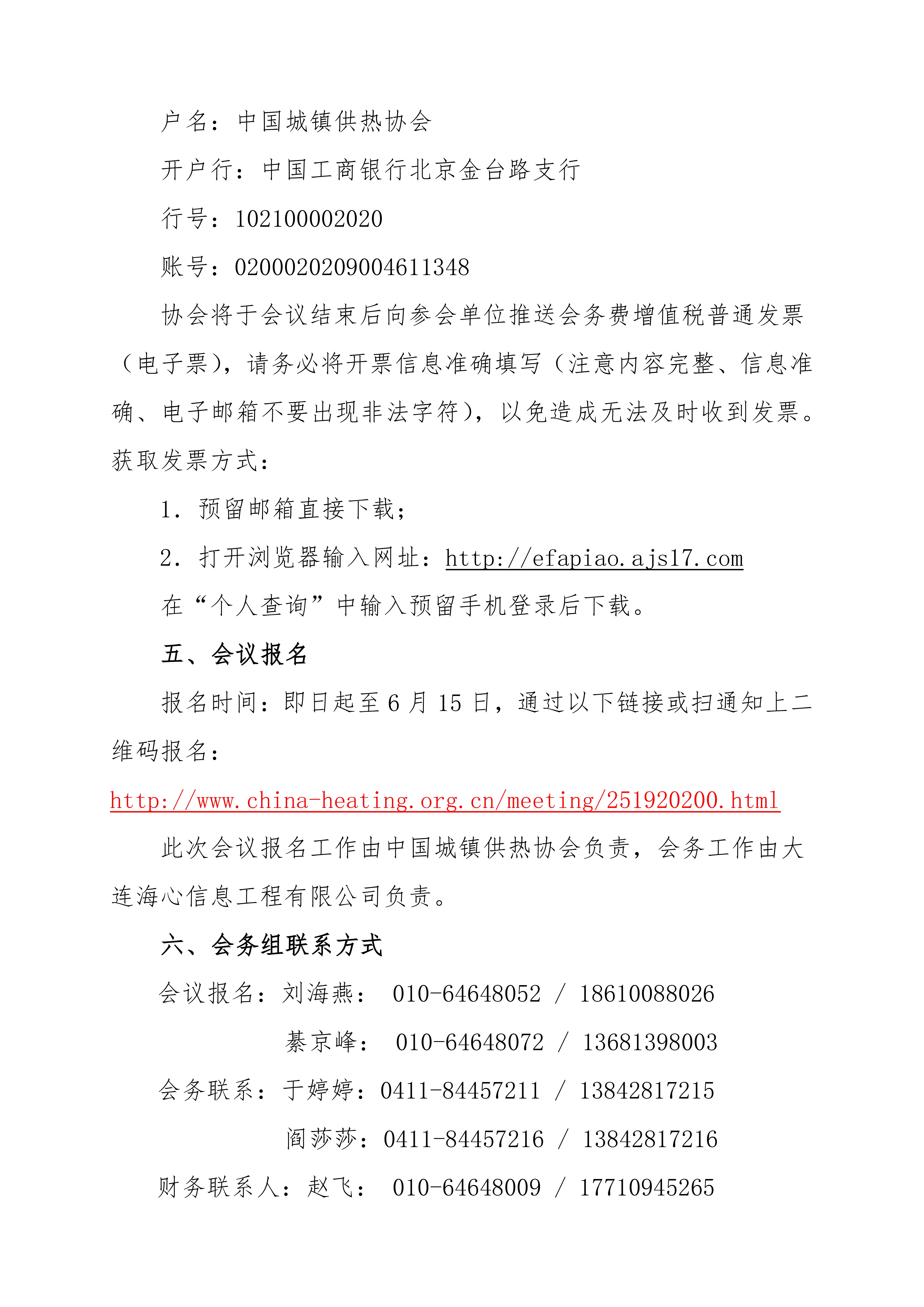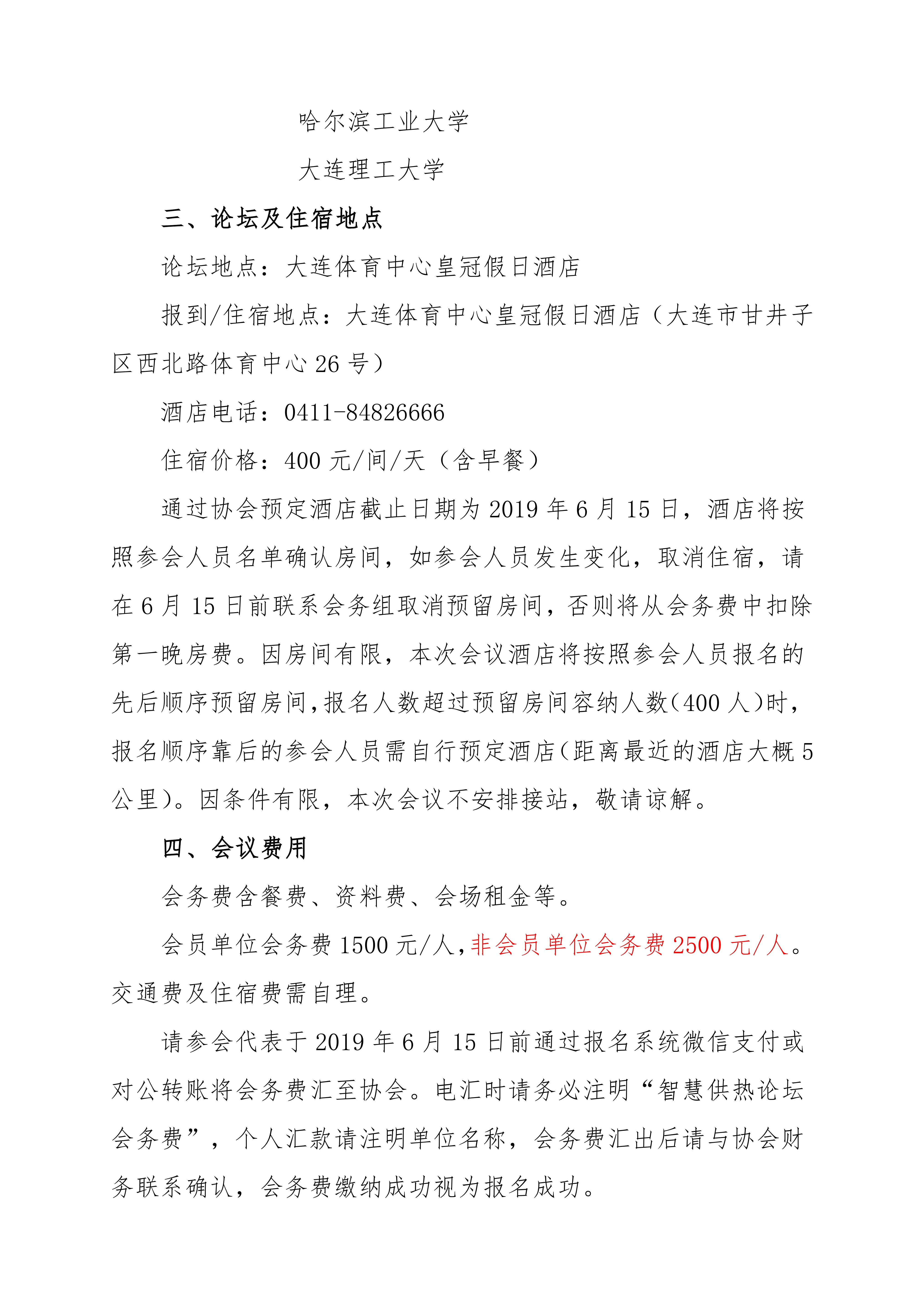 請參會代表于2019年6月15日前通過報名系統(tǒng)微信支付或?qū)D(zhuǎn)賬將會務(wù)費匯至協(xié)會。電匯時請務(wù)必注明“智慧供熱論壇會務(wù)費”,個人匯款請注明單位名稱,會務(wù)費匯出后請與協(xié)會財務(wù)聯(lián)系確認,會務(wù)費繳納成功視為報名成功。