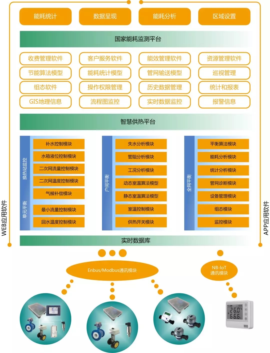 智慧供熱系統(tǒng)由應(yīng)用系統(tǒng)、數(shù)據(jù)系統(tǒng)、通信系統(tǒng)和平衡系統(tǒng)等子系統(tǒng)構(gòu)成。通過換熱站平衡、單元和樓棟平衡和戶間平衡三個層級的熱平衡技術(shù),同時結(jié)合手機(jī)APP交互平臺、WEB交互平臺,以及節(jié)能優(yōu)化系統(tǒng)、管路診斷系統(tǒng)、能耗分析系統(tǒng)、設(shè)備管理系統(tǒng)、統(tǒng)計報表系統(tǒng)等,以個性供熱、舒適供熱為目標(biāo),對供熱系統(tǒng)進(jìn)行全數(shù)字化的監(jiān)控和高度智能化的管理,實現(xiàn)系統(tǒng)監(jiān)控、節(jié)能降耗、客戶管理、人員管理、設(shè)備管理、資源管理等綜合管理功能,從而提升熱網(wǎng)運(yùn)行的綜合效益。
