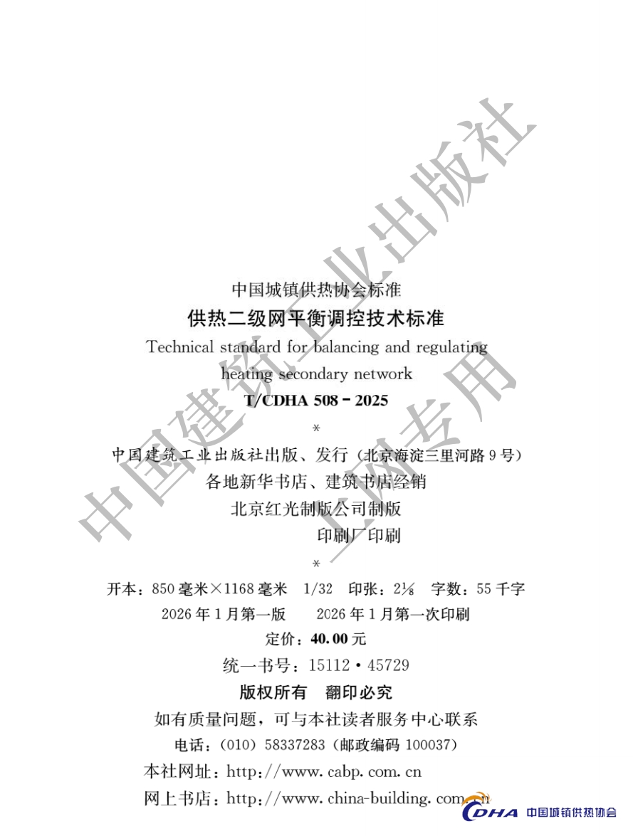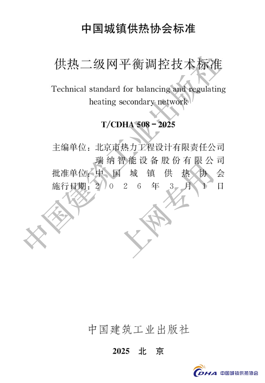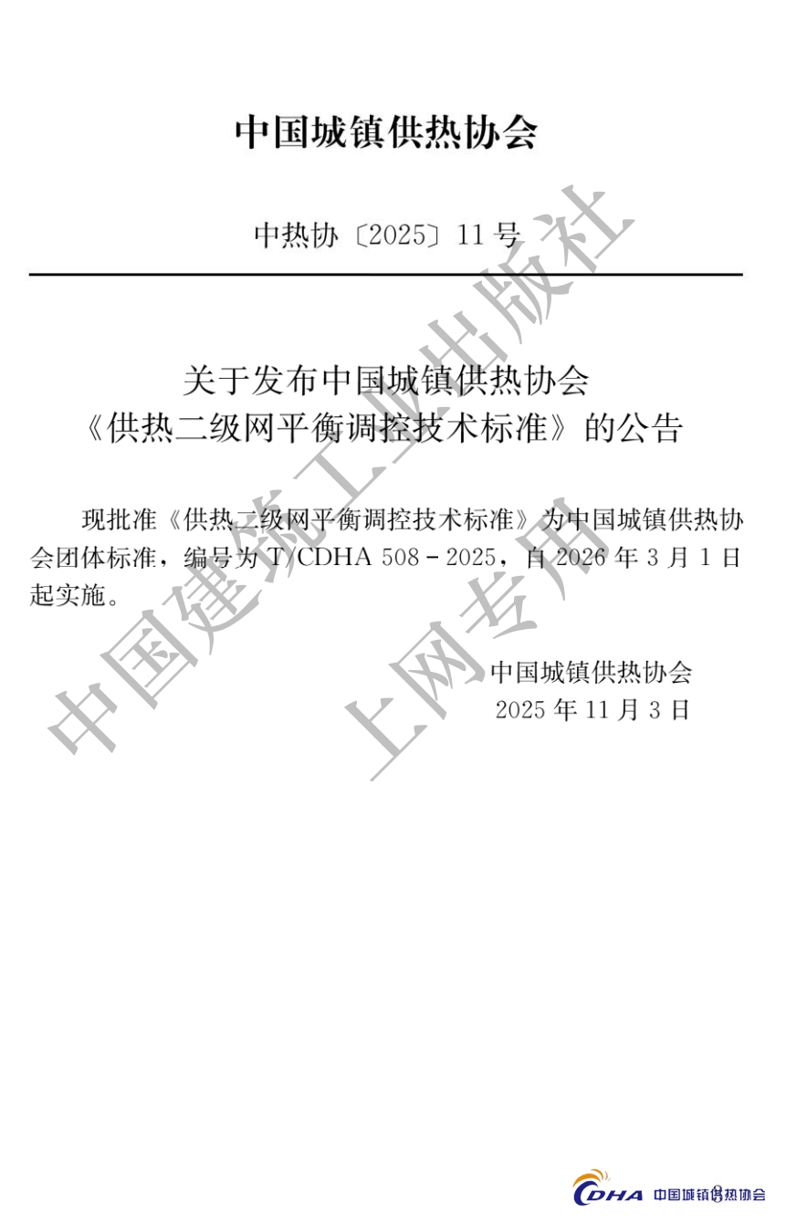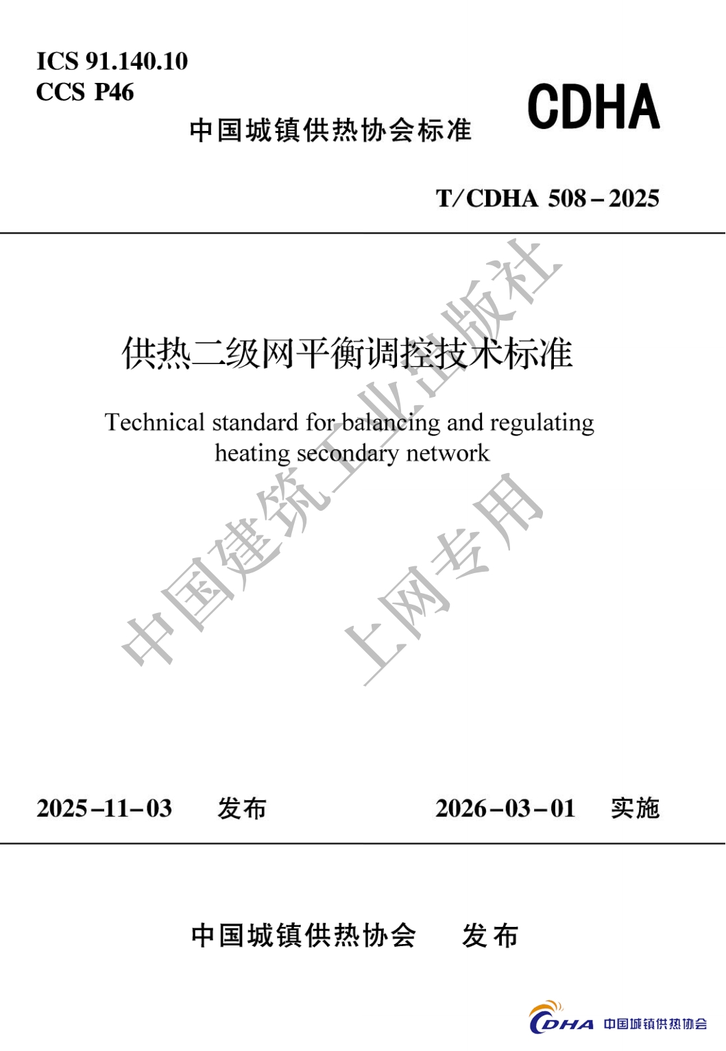 為保障供熱質量,提高供熱系統(tǒng)節(jié)能水平,規(guī)范二級網平衡調控技術應用,協(xié)會制定并發(fā)布團體標準《供熱二級網平衡調控技術標準》(T/CDHA 508-2025),自2026年3月1日實施。