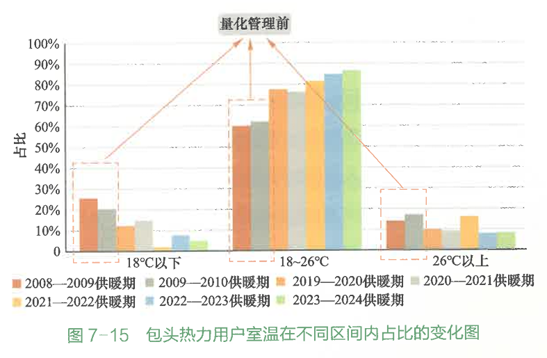 同時,用戶室溫在18-26℃的比例由60.1%升至87%,節(jié)能降耗的同時達到了均衡供熱的效果(圖7-15)。