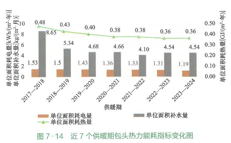包頭熱力從2018-2019供暖期開始執(zhí)行熱耗精細化管理工作,截至2023-2024供暖期,單位面積耗熱量從0.48GJ/(㎡·年)降至0.36GJ/(㎡·年),累計減少能源浪費2520萬GJ,折合標(biāo)準(zhǔn)煤86萬t,累計減少碳排放214萬t;單位面積耗電量從1.53kWh/(㎡·年)降至1.19kWh/(㎡·年),累計節(jié)約用電7140萬kWh;單位面積補水量從8.65 kg/(㎡·月)降至4.54 kg/(㎡·月),累計節(jié)約用水518萬m3(圖7-14)。