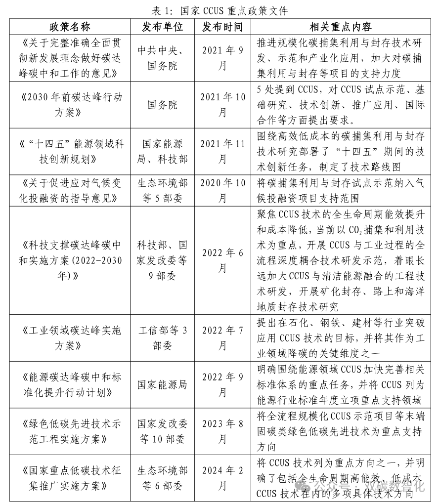 2020年9月碳達(dá)峰碳中和目標(biāo)提出后,國家各部委和地方政府先后出臺(tái)相關(guān)政策文件,對(duì)CCUS 技術(shù)研發(fā)、標(biāo)準(zhǔn)和融資等方面作出積極部署,逐步推動(dòng) CCUS 技術(shù)的研發(fā)和規(guī)?;瘧?yīng)用。截至目前,我國已發(fā)布的CCUS 相關(guān)政策文件涵蓋發(fā)展規(guī)劃、技術(shù)標(biāo)準(zhǔn)、試驗(yàn)示范、技術(shù)目錄等方面,CCUS 政策體系初具雛形。重點(diǎn)政策如下: