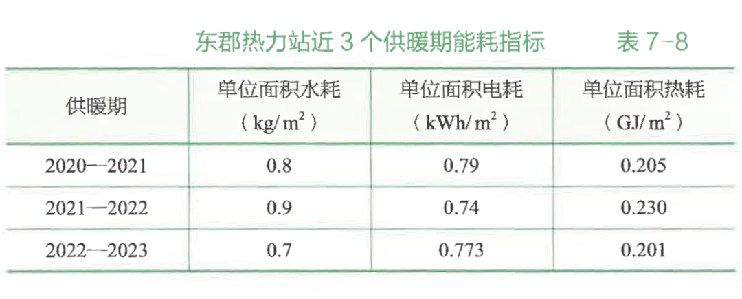 為了有效節(jié)能降耗,運(yùn)城熱力在每年的供熱準(zhǔn)備階段制定水耗、電耗、熱耗考核指標(biāo),考核到站,考核到人。在供熱運(yùn)行階段,調(diào)度中心對熱力站運(yùn)行參數(shù)進(jìn)行實(shí)時監(jiān)控,發(fā)現(xiàn)異常立即通知熱力站站長到站查看處理,每日對所有熱力站水耗、電耗、熱消耗指標(biāo)進(jìn)行排名、通報(bào);熱力站站長每日根據(jù)調(diào)度中心通報(bào),結(jié)合熱力站運(yùn)行參數(shù)、二次側(cè)管網(wǎng)情況和用戶實(shí)際供暖效果對各項(xiàng)指標(biāo)進(jìn)行分析,發(fā)現(xiàn)異常及時調(diào)整運(yùn)行參數(shù)、查找漏水點(diǎn);運(yùn)行分公司每月對各熱力站指標(biāo)進(jìn)行統(tǒng)計(jì)分析,橫向?qū)Ρ韧愋蜔崃φ?,縱向?qū)Ρ壬弦还┡谕谙?,對異常指?biāo)進(jìn)行分析,并采取相應(yīng)措施。東郡熱力站近3個供暖期能耗指標(biāo)見表7-8。