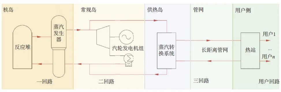 核能供熱的典型系統(tǒng)流程圖如下圖所示。從核反應(yīng)堆送出的一回路高溫蒸汽通過(guò)蒸汽發(fā)生器產(chǎn)生二回路的中間高溫蒸汽;中間高溫蒸汽去往供熱島通過(guò)蒸汽轉(zhuǎn)換系統(tǒng)產(chǎn)生三回路的工業(yè)供熱蒸汽,當(dāng)核能同時(shí)供熱和發(fā)電時(shí),則部分中間高溫蒸汽還去往汽輪發(fā)電機(jī)組膨脹做功發(fā)電;三回路中的工業(yè)蒸汽經(jīng)過(guò)長(zhǎng)距離的供熱管網(wǎng),輸送到用戶側(cè)的供熱首站,再送往各個(gè)用戶。