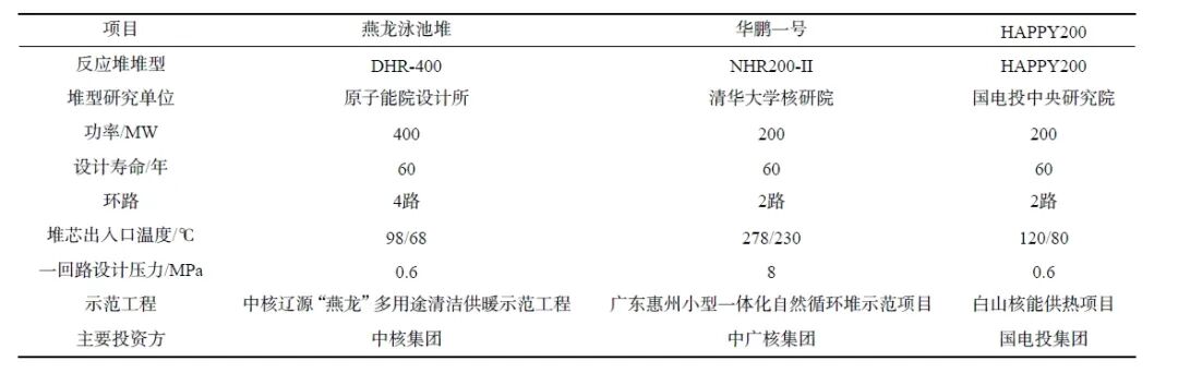 早在20世紀(jì)60年代,國(guó)內(nèi)就開始對(duì)核能供熱的研究,但集中于供熱小堆的研究;由于政策及經(jīng)濟(jì)性等原因,中途一度中斷;于2000年后開始重啟供熱堆研究。目前國(guó)內(nèi)研究的主要供熱小堆如下表所示: